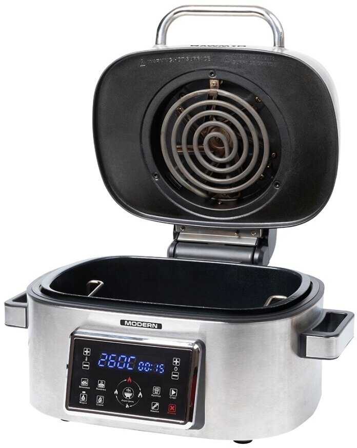 2. Комплектация, благоря ей она заменит и духовку и сковородку и даже мангал, а также есть корзинка для фритюра и функция сушка для овощей и фруктов.
