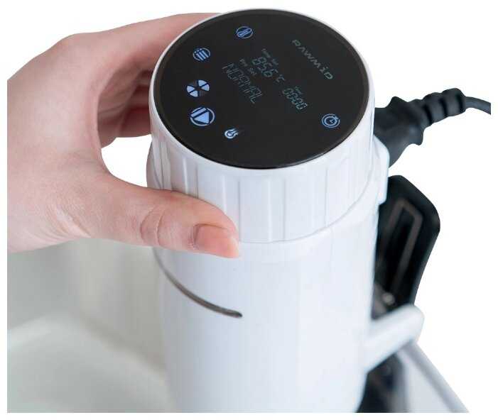 - + высокая мощность (1 кВт) и точность поддержания температуры (0,1 °С), рабочий объём до 20 л, предустановленные программы (30 , шт), комлектация, книга рецептов, защиты. съёмный шнур питания, помимо сенсорного чисто управления есть ещё поворотное кольцо, механическое управление это надежнее, результаты приготовления - все на отлично