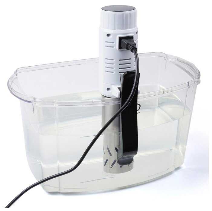 - + Удобен в эксплуатации, температуру поддерживает хорошо. Однако, справедливости ради, нужно отметить, что в специальном контейнере для су-вид получается лучше, чем в обычной кастрюле (в кастрюле вода остывает быстрее, поэтому прибор работает практически беспрерывно). Очень вкусное мясо получается.