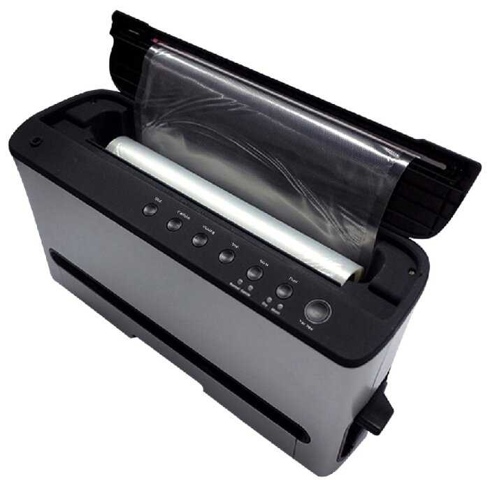 - + Очень удобный. Пакует качественно. Здорово, что рычаги надо опускать по очереди, не надо извращаться, удерживая пакет в нужном положении.