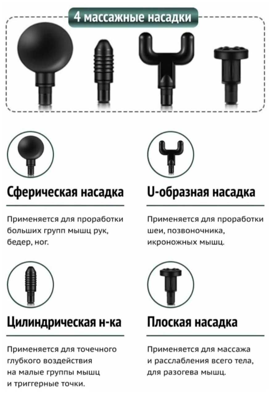 - Шарообразная насадка адаптируется под разные группы мышц: от мелких (руки, плечи) до крупных (ноги, спина).