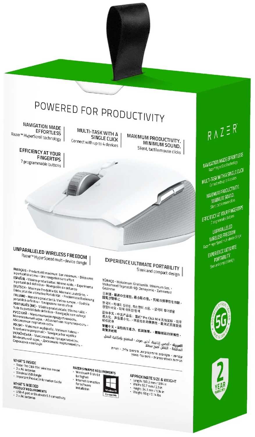 | Комплектация : | мышка Razer Pro Click Mini, USB беспроводной передатчик 2.4 ГГц (внутри мышки под верхней крышкой), 2 батарейки типа AA, важная информация о продукте |