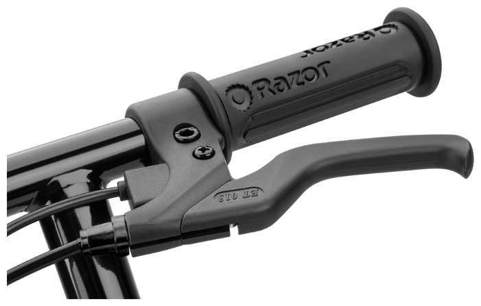 - Ручной тормоз с пластиковой колодкой на переднее колесо позволяет плавно снижать скорость.