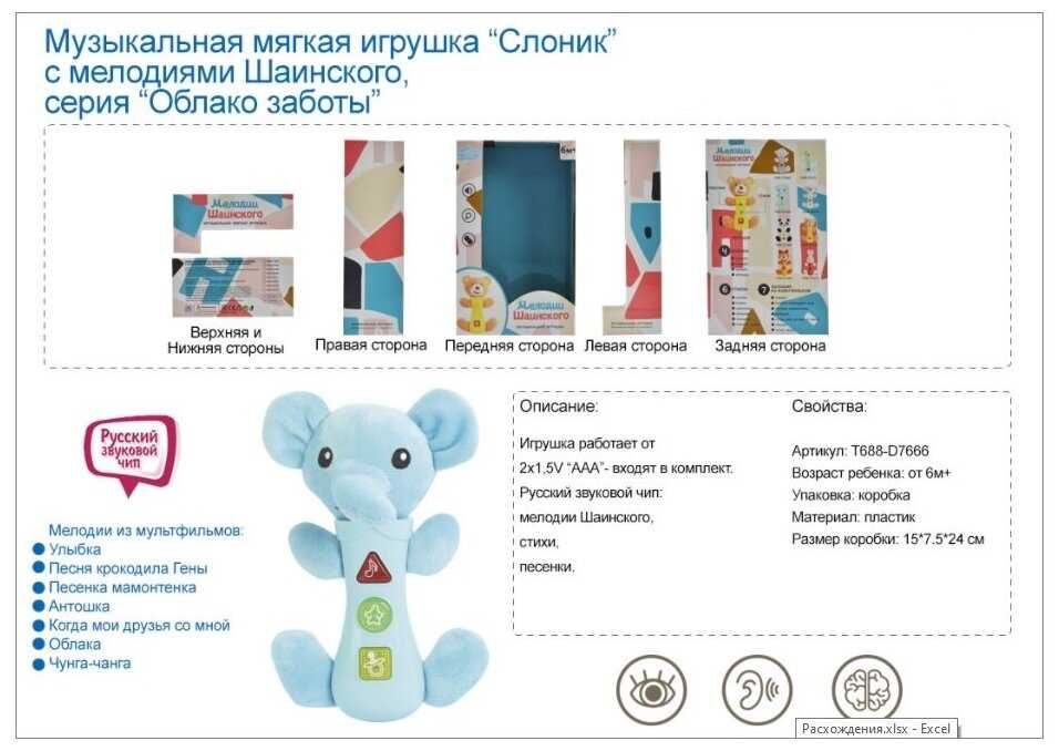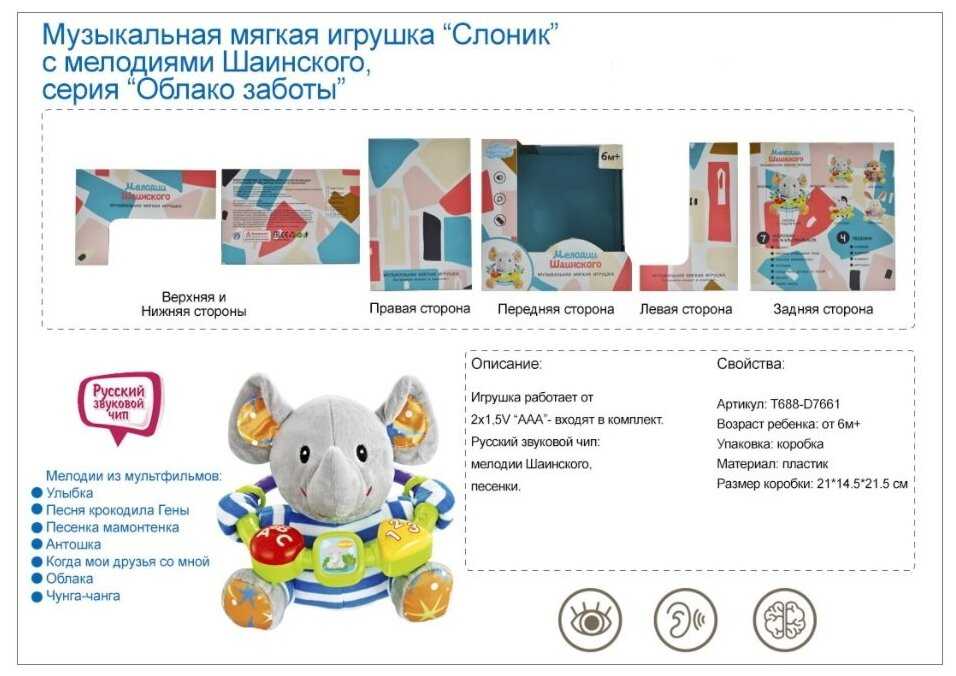 TONG DE Игрушка мягкая "Слоник", мелодии Шаинского, T688-D7661