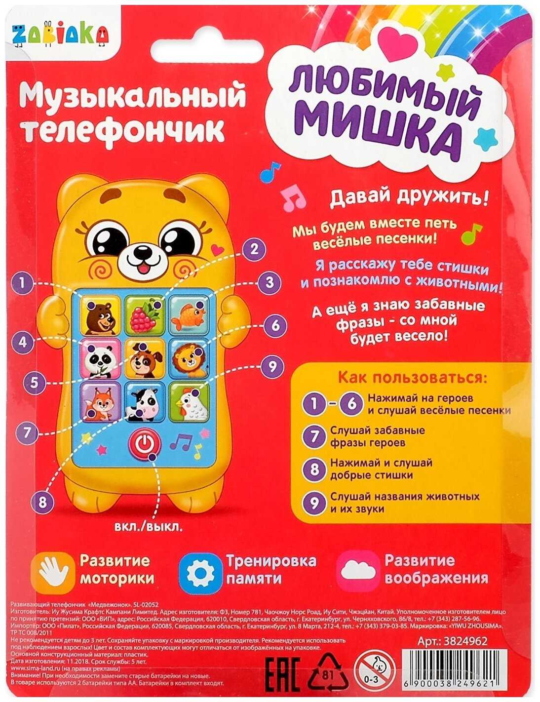 Забияка Развивающая игрушка Zabiaka Телефончик музыкальный Медвежонок, SL-02052