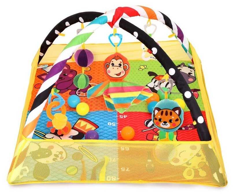 - комплектация: Две игровые дуги с 4 пластмассовыми съёмными подвесными игрушками и мягкими тканевыми флажками; Набор безопасных пластиковых шаров и корзинка-сетка для их хранения; Для удобства малыша в комплект поставки входит мягкая подушечка в виде слоника с шуршащими ушками.