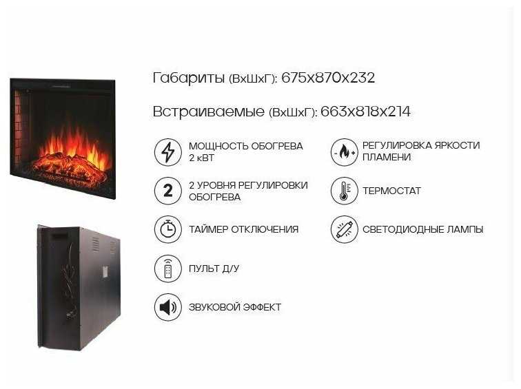 | Особенности : | дистанционное управление, закрытый, защита от перегрева, работа от сети, эффект живого огня |