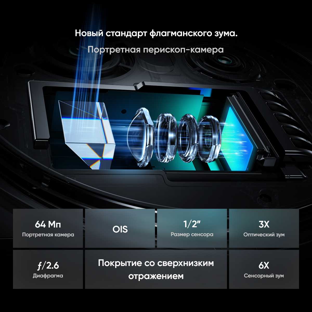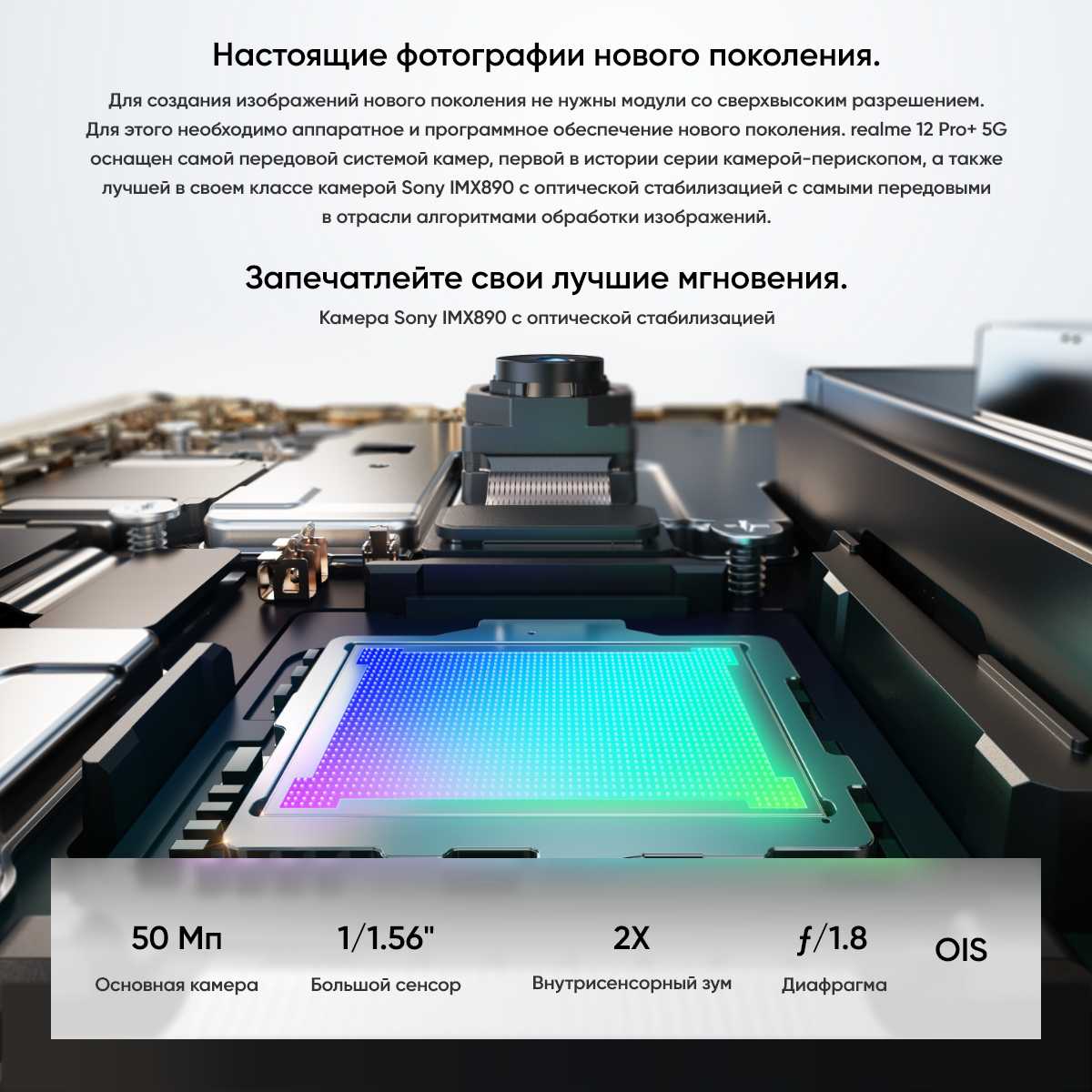 Смартфон работает на процессоре Snapdragon 7s Gen 2, который обеспечивает достойную производительность для повседневных задач и игр. Устройство имеет до 12 ГБ оперативной памяти LPDDR4X и 256 ГБ внутреннего хранилища UFS 3.1. Дополнительно, Realme 12 Pro Plus поддерживает функцию расширения оперативной памяти (DRE), что позволяет использовать встроенное хранилище как виртуальную оперативную память (FoneArena).