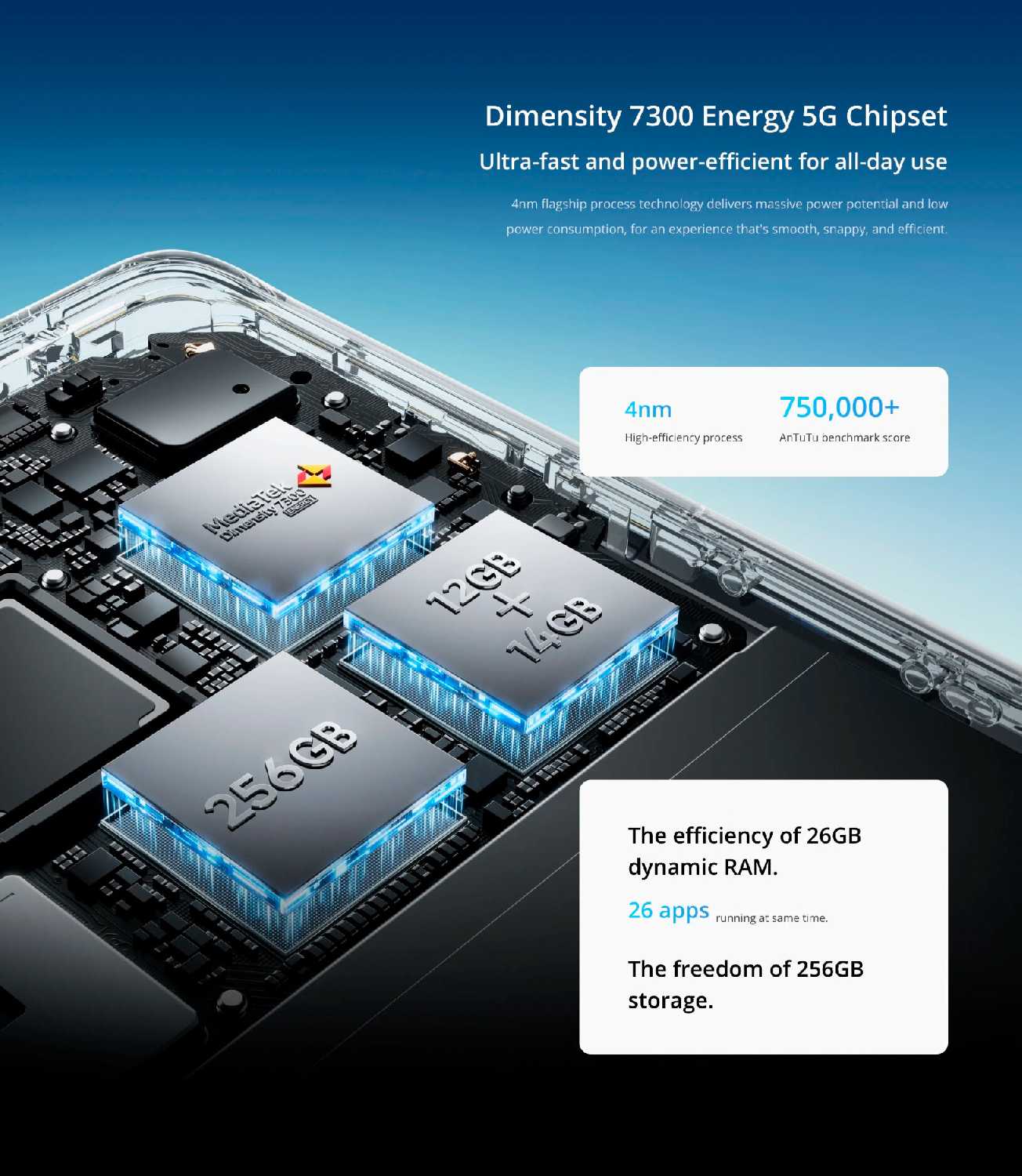 Процессор Snapdragon 695 справляется с повседневными задачами и нетребовательными играми вроде Asphalt 9 на средних настройках. Однако в тяжёлых играх, например, Genshin Impact, наблюдаются падения FPS. Оперативная память 8 ГБ (с возможностью расширения до 16 ГБ) позволяет держать в фоне несколько приложений без заметных лагов. -