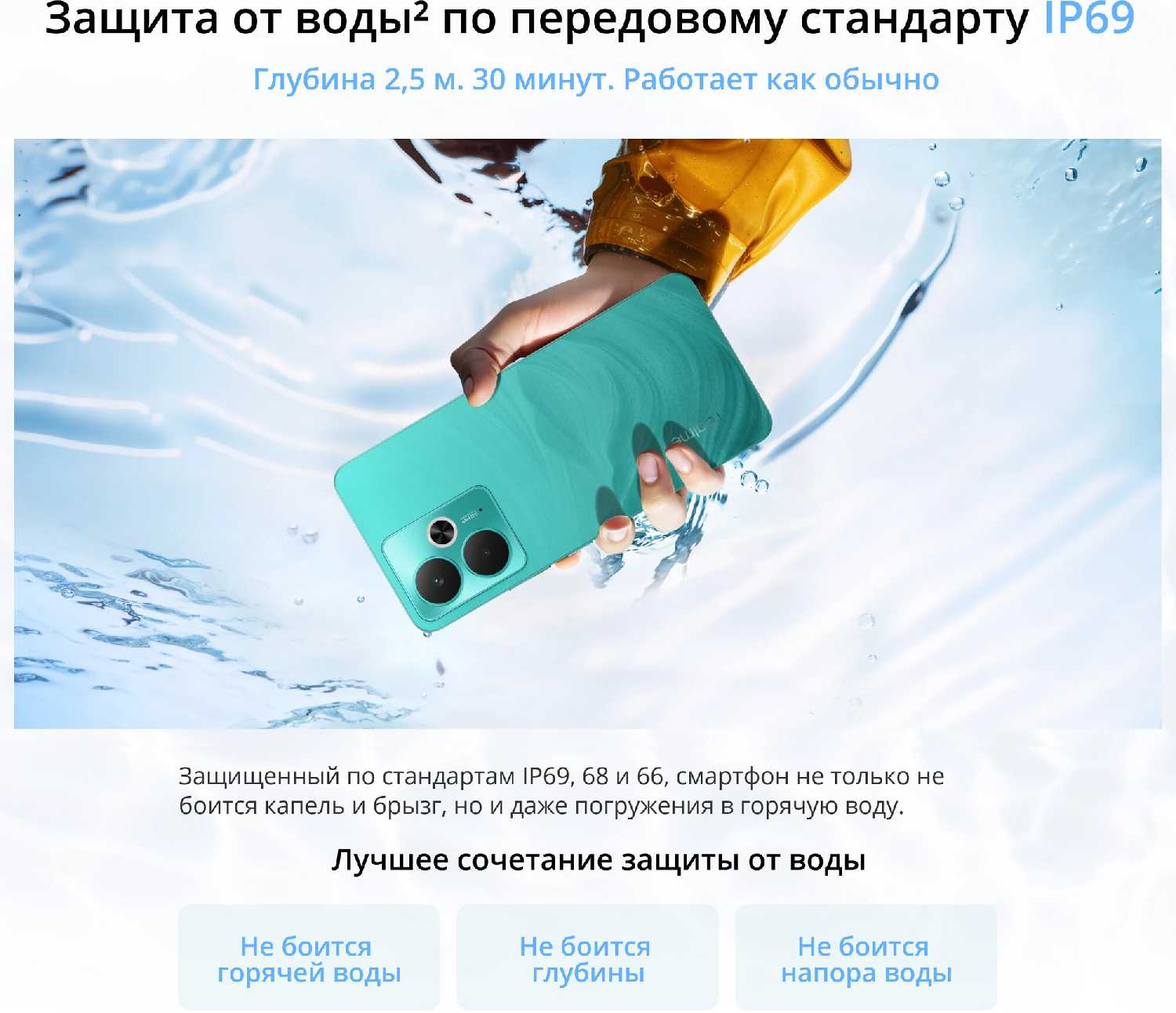 Степень защиты IP позволяет использовать смартфон под дождем и даже мыть его, а некоторые пользователи случайно проверяли устройство, роняя его в воду, после чего телефон продолжал работать. Производитель предусмотрел даже специальный режим для подводной съемки, что подтверждает высокий уровень влагозащиты. Эта характеристика особенно ценится теми, кто ведет активный образ жизни или часто находится в условиях, где возможен контакт с водой. -