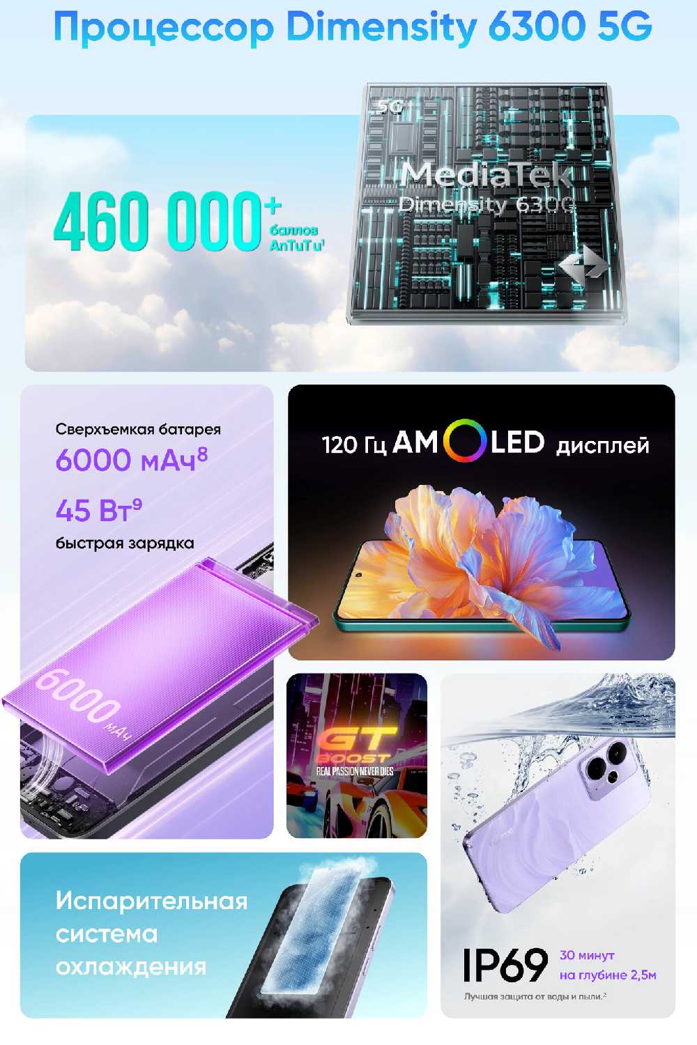 - + • Очень шустрый процессор Dimensity 6300 — телефон реально летает и почти не греется.