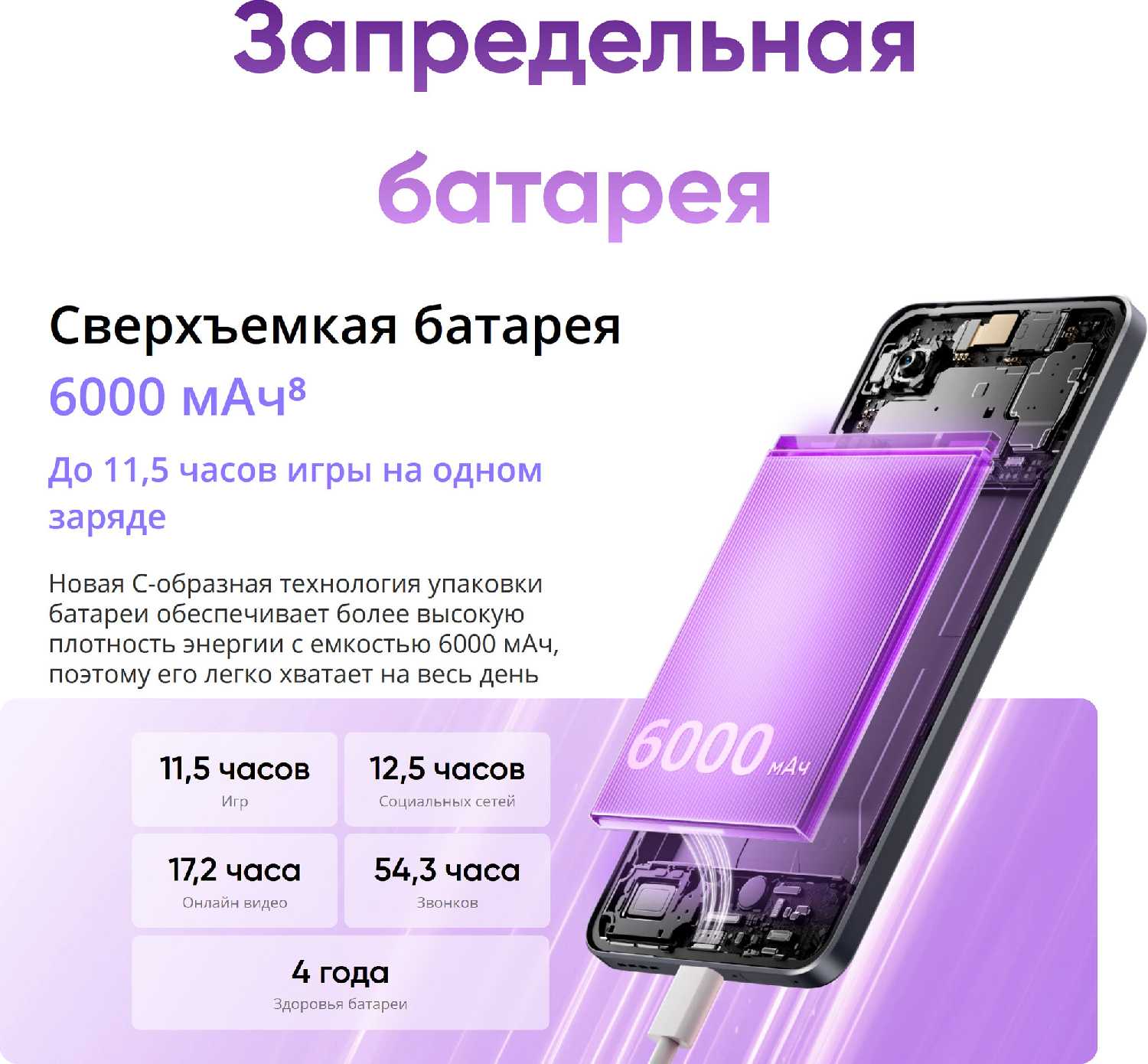 При умеренном использовании, включая 2-3 часа в день с включенным интернетом, батареи хватает на 3-4 дня. При очень активном использовании, включая игры, просмотр видео и серфинг в интернете, заряда хватает на полные сутки. Емкость аккумулятора 6000 мАч в сочетании с быстрой зарядкой 45 Вт позволяет быстро восстановить заряд утром перед работой. -