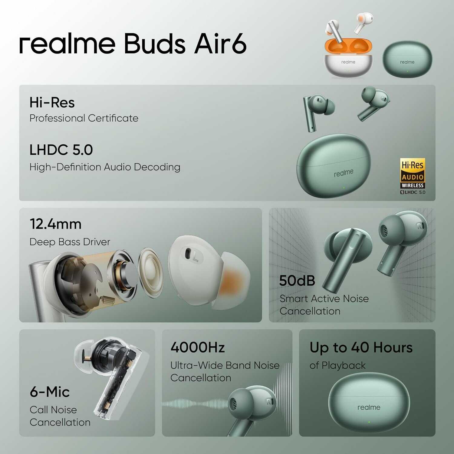 Базовая версия работает через SBC и AAC, что обеспечивает совместимость с iOS-устройствами. Модель Buds Air 6 Pro поддерживает кодек LHDC для высококачественного стриминга, но для его активации требуется смартфон Realme с чипом Snapdragon 8 Gen 1 и выше. Аудиофилам, ориентированным на LDAC, производитель рекомендует другие модели линейки. -