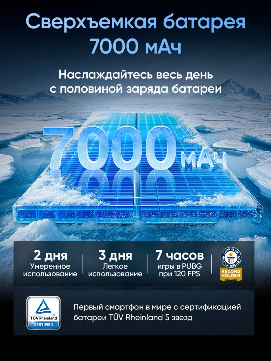- Аккумулятор на 7000 мАч держит заряд 1-2 суток при активном использовании, включая видео, фото и интернет, что превосходит многие флагманы и позволяет забыть о пауэрбанке.