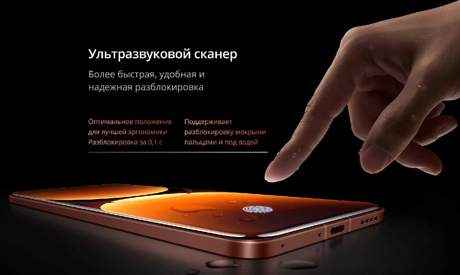 - Ультразвуковой сканер отпечатков пальцев распознаёт касание за 0.2 секунды даже при влажной коже или лёгком загрязнении.