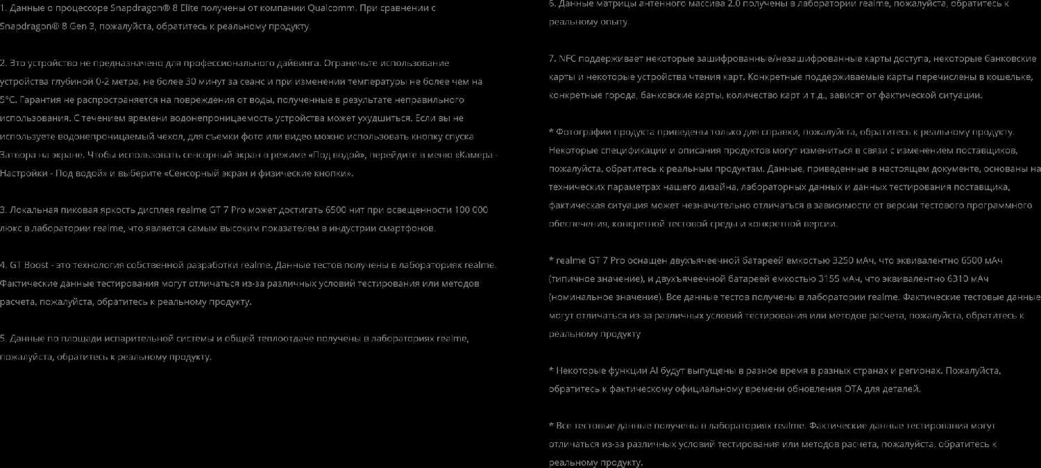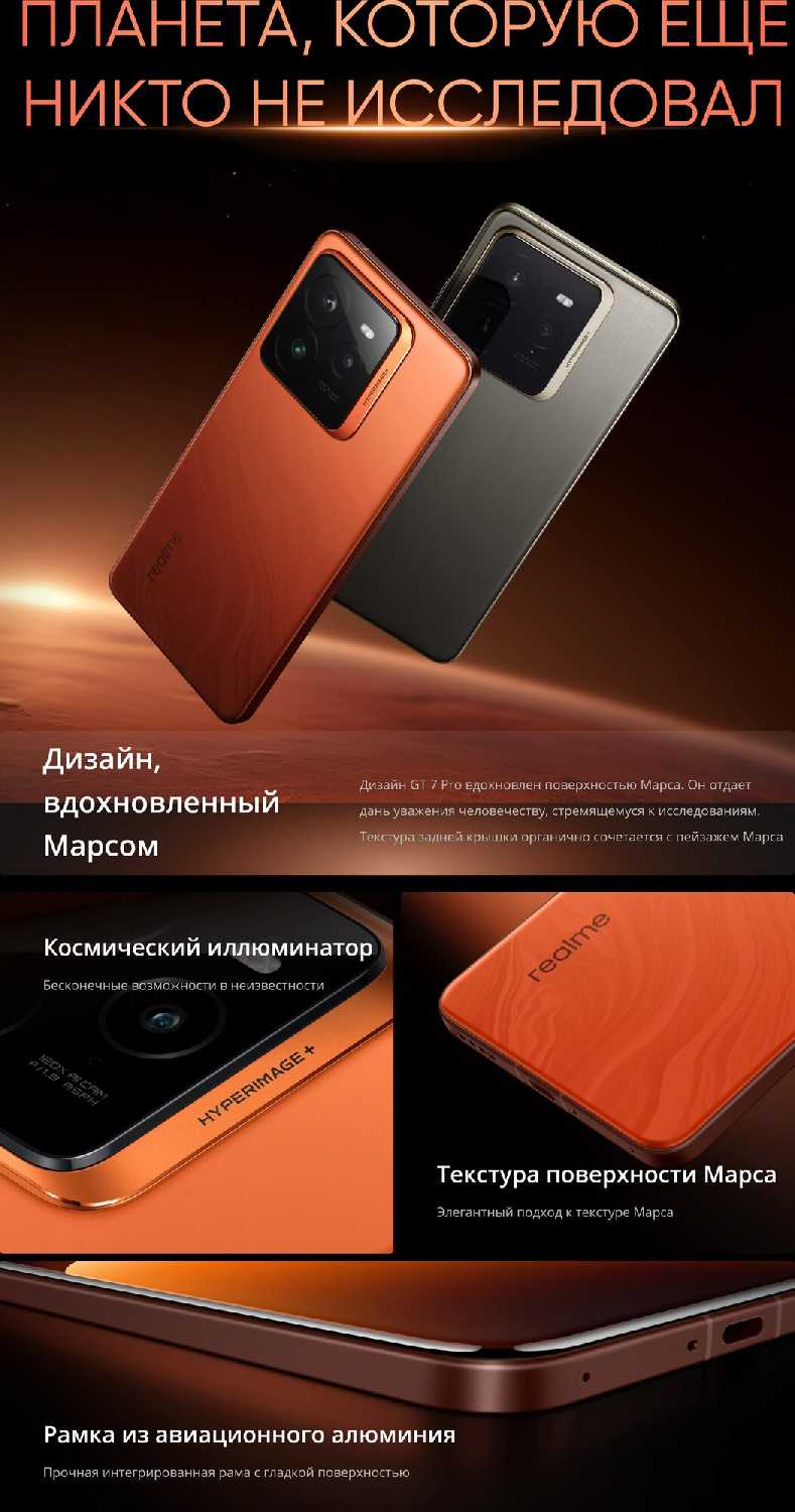 Стереодинамики описываются как "суховатые" – при этом нижний динамик часто перекрывается ладонью во время игр. Хотя корпус с матовым покрытием не собирает отпечатки, габариты и вес устройства не всем удобны. Защита IP69 (пыле/влагозащита) подтверждена тестами под дождём. Идеальный пользователь GT7 Pro – геймер или мультизадачник, ценящий максимальную производительность. Фотографы-любители оценят камеру для повседневной съёмки, но профессионалам не хватит возможностей. Яркий дизайн "Марсианский песок" ориентирован на молодежь. При цене 58-65 тыс. рублей аппарат позиционируется как "убийца флагманов" для тех, кто готов мириться с сырым софтом ради топового "железа".