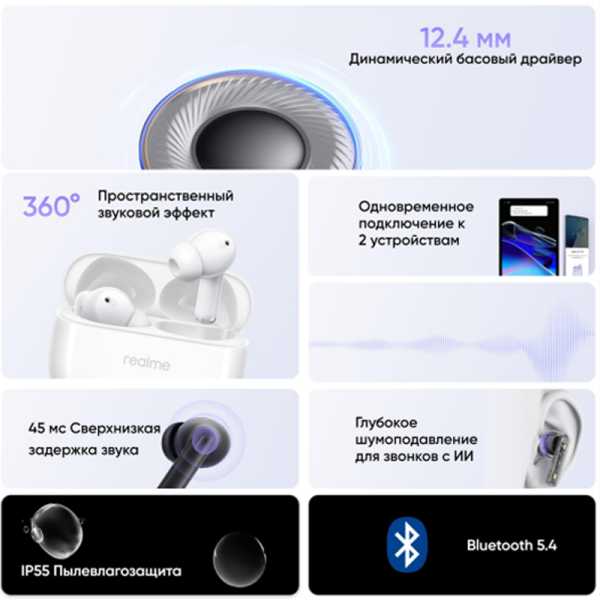 Функция Dual Connection активируется через realme Link: можно синхронизировать со смартфоном и ноутбуком (Windows/Linux). При входящем звонке на телефоне звук автоматически переключается, а медиаконтент с ПК приостанавливается. Важно: для iOS мультипойнт работает только с техникой Apple, подключение к Android-планшету требует ручного переключения. -
