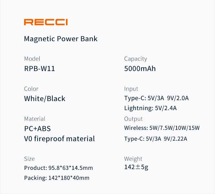 Характеристи Recci Mini Magnetic (15W, 10000 mAh, PD20W)