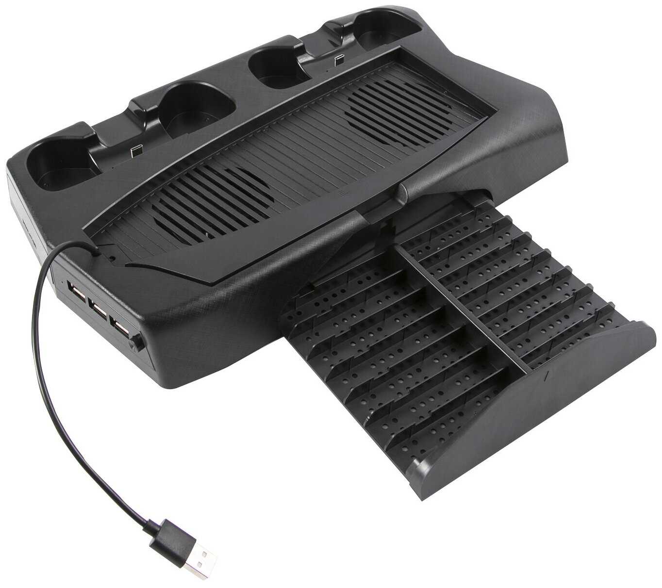 Есть охлаждение. Зарядка контролеров на борту, подставка для дисков.