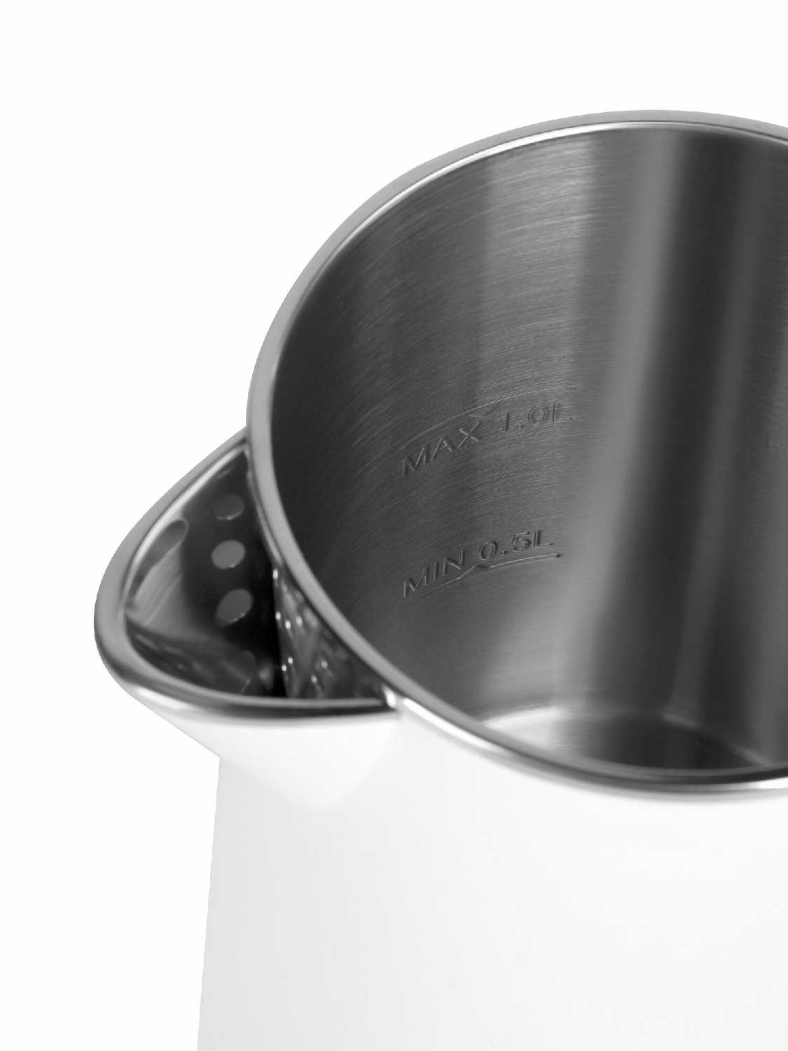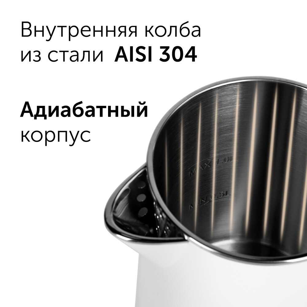 Π§Π°ΠΉΠ½ΠΈΠΊ ΠΎΡΠ½Π°ΡΠ΅Π½ ΡΠ΅Π»ΡΠ½ΠΎΠΉ ΠΊΠΎΠ»Π±ΠΎΠΉ ΠΈΠ· Π½Π΅ΡΠΆΠ°Π²Π΅ΡΡΠ΅ΠΉ ΡΡΠ°Π»ΠΈ Π±Π΅Π· ΡΠ²ΠΎΠ², ΡΡΠΎ ΠΈΡΠΊΠ»ΡΡΠ°Π΅Ρ ΠΏΡΠΎΡΠ΅ΡΠΊΠΈ ΠΈ ΠΊΠΎΠ½ΡΠ°ΠΊΡ Π²ΠΎΠ΄Ρ Ρ ΠΏΠ»Π°ΡΡΠΈΠΊΠΎΠΌ. ΠΡΠΎ ΠΏΡΠ΅Π΄ΠΎΡΠ²ΡΠ°ΡΠ°Π΅Ρ ΠΏΡΠΈΠ²ΠΊΡΡ ΠΌΠ΅ΡΠ°Π»Π»Π° ΠΈ ΠΎΠ±Π΅ΡΠΏΠ΅ΡΠΈΠ²Π°Π΅Ρ Π³ΠΈΠ³ΠΈΠ΅Π½ΠΈΡΠ½ΠΎΡΡΡ. ΠΠΎΠΏΠΎΠ»Π½ΠΈΡΠ΅Π»ΡΠ½ΠΎ ΠΊΠΎΠ»Π±Π° ΡΠΎΡ ΡΠ°Π½ΡΠ΅Ρ ΡΠ΅ΠΏΠ»ΠΎ: Π²ΠΎΠ΄Π° ΠΎΡΡΠ°Π΅ΡΡΡ Π³ΠΎΡΡΡΠ΅ΠΉ 1β2 ΡΠ°ΡΠ° ΠΏΠΎΡΠ»Π΅ ΠΊΠΈΠΏΡΡΠ΅Π½ΠΈΡ. -