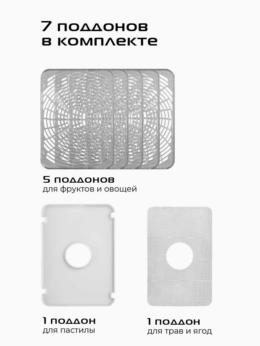Действительно большая сушилка с хорошим качеством, выглядит надежной и долговечной. В наборе много разных поддонов, есть даже для пастилы и трав. В настройках разобрались быстро, панель управления понятна.