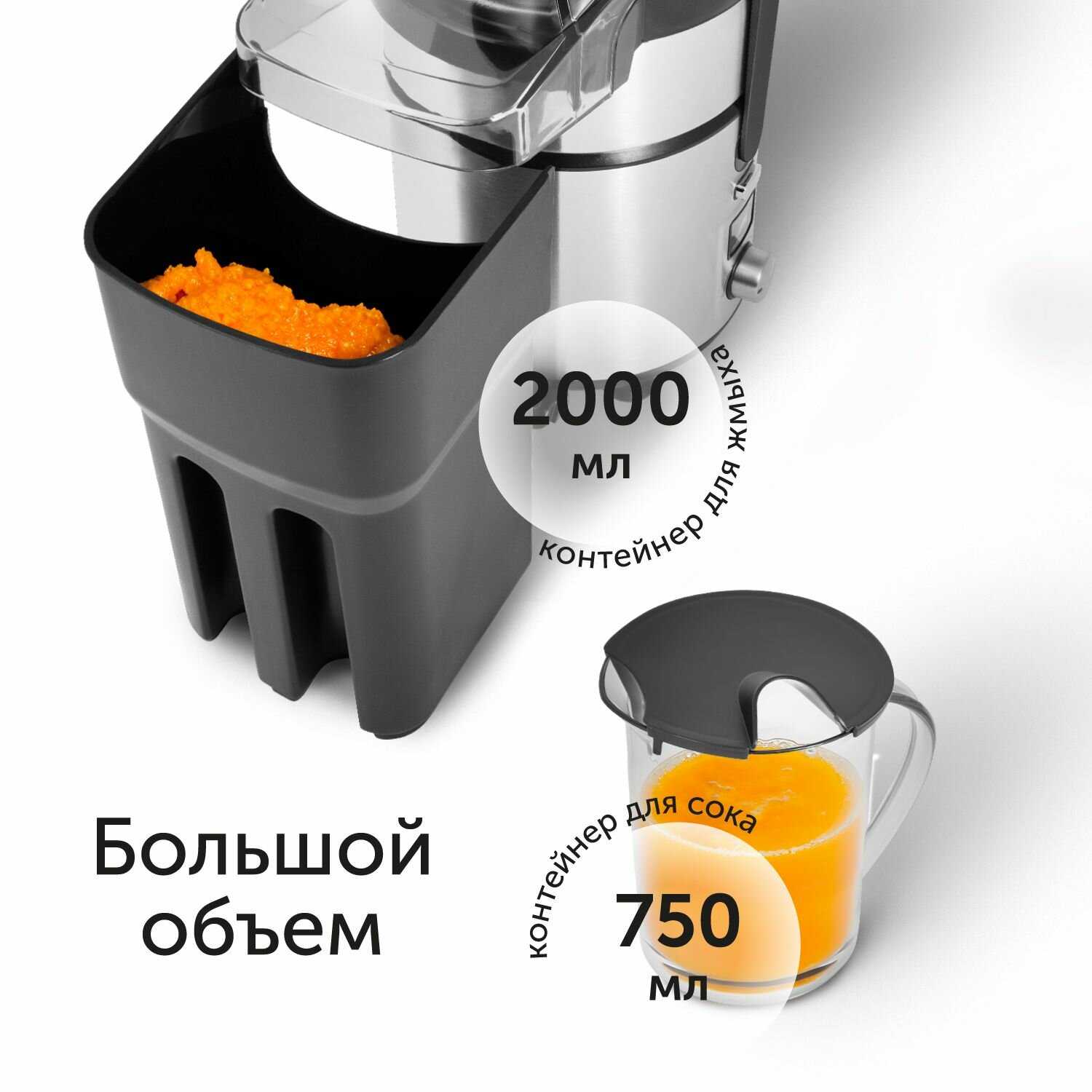 ΠΠΌΠ΅ΡΡΠΈΠΌΠΎΡΡΡ ΡΠ°ΡΠΈ Π΄Π»Ρ ΡΠΎΠΊΠ° ΡΠΎΡΡΠ°Π²Π»ΡΠ΅Ρ 800 ΠΌΠ» β ΡΡΠΎΠ³ΠΎ Ρ Π²Π°ΡΠ°Π΅Ρ Π΄Π»Ρ 4β5 ΠΏΠΎΡΡΠΈΠΉ. ΠΠΎΠ½ΡΠ΅ΠΉΠ½Π΅Ρ Π΄Π»Ρ ΠΆΠΌΡΡ Π° ΠΎΠ±ΡΡΠΌΠΎΠΌ 1,5β2 Π» ΡΡΠ΅Π±ΡΠ΅Ρ ΠΎΡΠΈΡΡΠΊΠΈ ΠΏΠΎΡΠ»Π΅ ΠΎΠ±ΡΠ°Π±ΠΎΡΠΊΠΈ 1β1.5 ΠΊΠ³ ΡΠ±Π»ΠΎΠΊ ΠΈΠ»ΠΈ ΠΌΠΎΡΠΊΠΎΠ²ΠΈ. ΠΡΠΈ Π±ΠΎΠ»ΡΡΠΈΡ ΠΎΠ±ΡΡΠΌΠ°Ρ ΠΆΠΌΡΡ Π½Π°ΡΠΈΠ½Π°Π΅Ρ ΡΠΏΠ»ΠΎΡΠ½ΡΡΡΡΡ, ΡΠ½ΠΈΠΆΠ°Ρ ΡΡΡΠ΅ΠΊΡΠΈΠ²Π½ΠΎΡΡΡ ΠΎΡΠΆΠΈΠΌΠ°. -