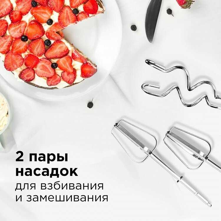 Пользователи отмечают, что прибор взбивает 5 яичных белков с сахаром до устойчивых пиков за 2-4 минуты на высоких скоростях. Турборежим обеспечивает максимальную эффективность при работе с плотными массами, сохраняя стабильность миксера без сильной вибрации. При непрерывной работе до 20 минут возможен легкий нагрев корпуса, но металлическая конструкция быстро остывает. -