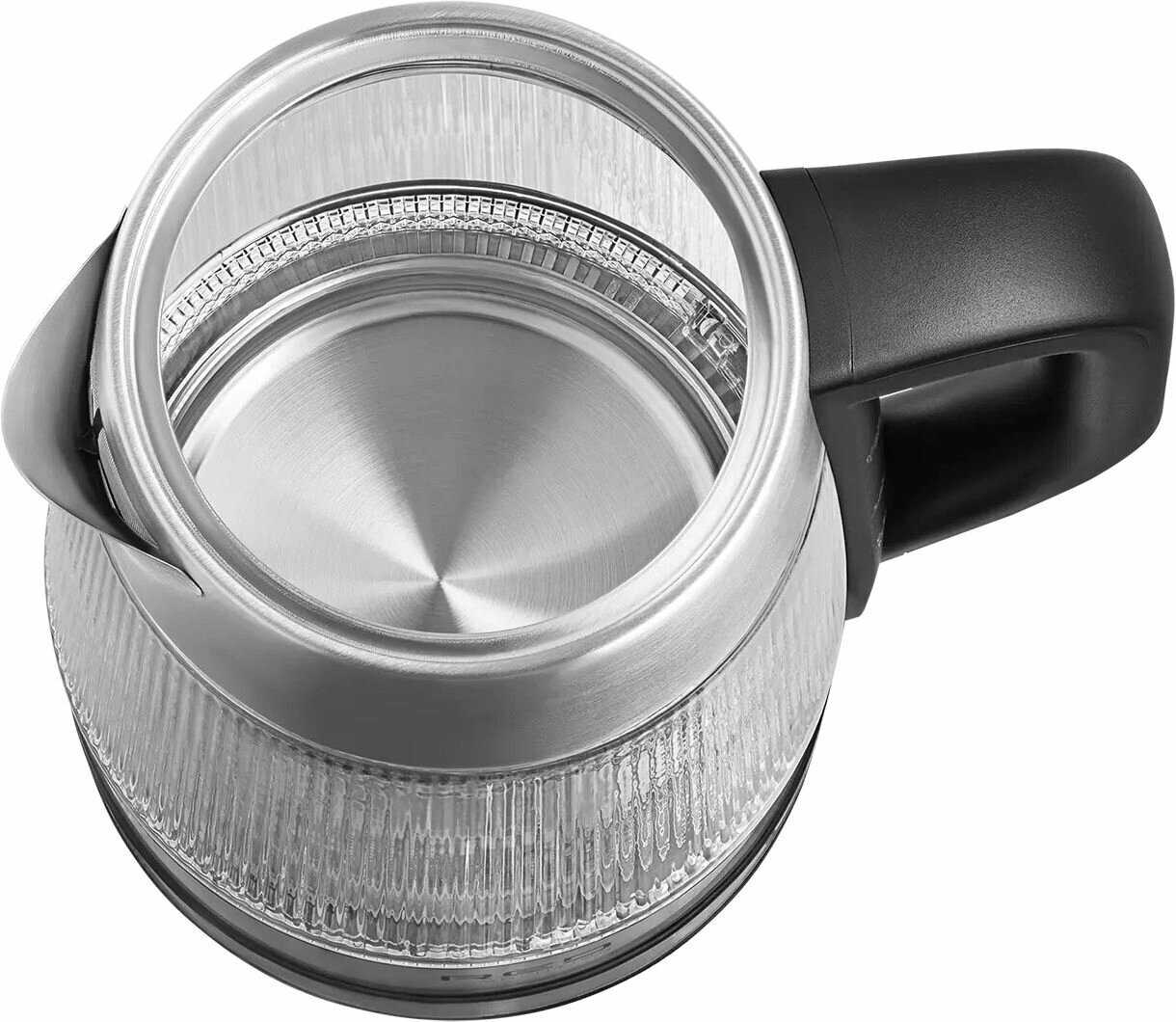 Полностью съемная крышка обеспечивает беспрепятственный доступ к внутренней поверхности для очистки от накипи. Гладкое стекло внутри колбы не имеет труднодоступных углов и легко моется стандартными средствами. Пользователи особенно ценят возможность тщательной ручной очистки без ограничений, характерных для моделей с несъемными крышками. -