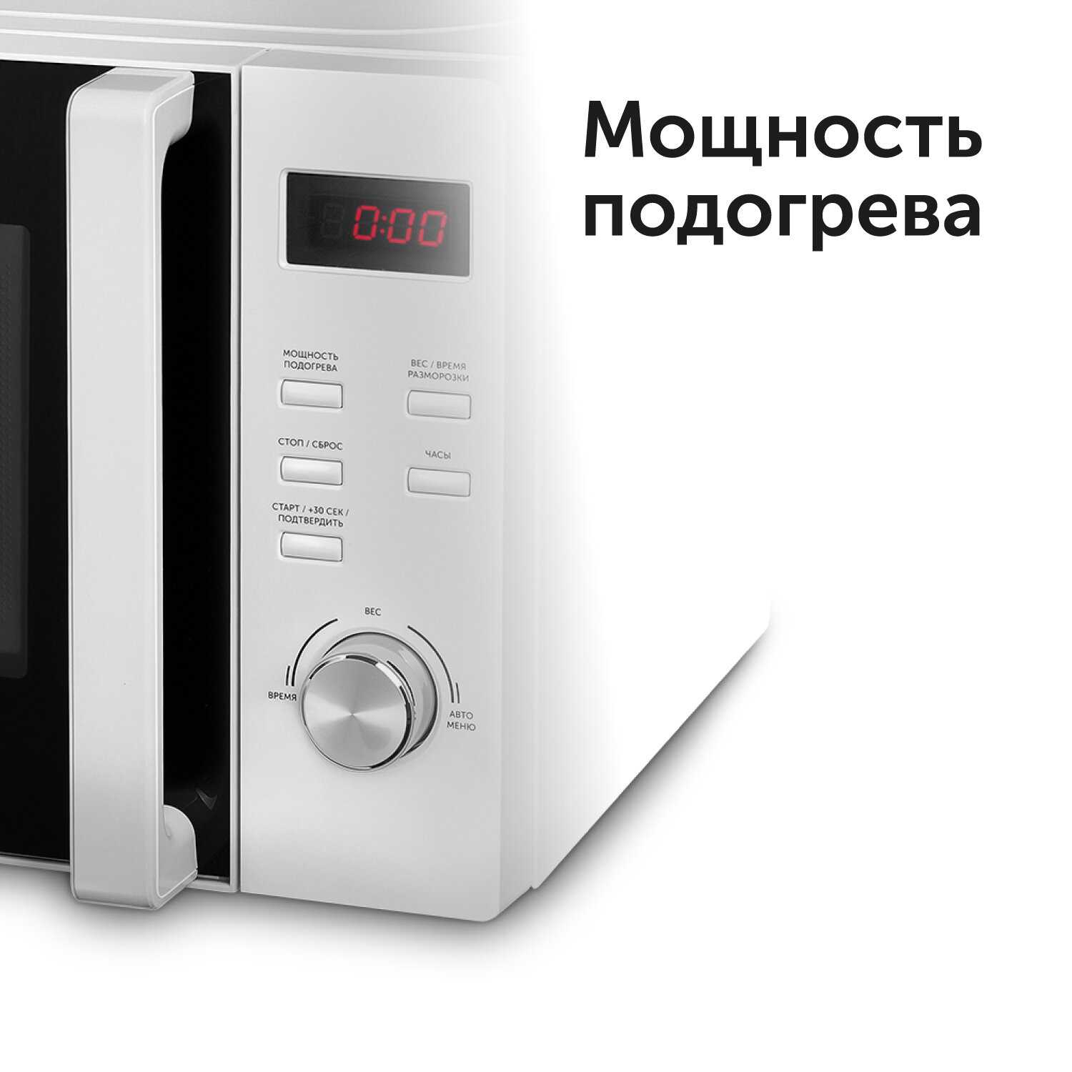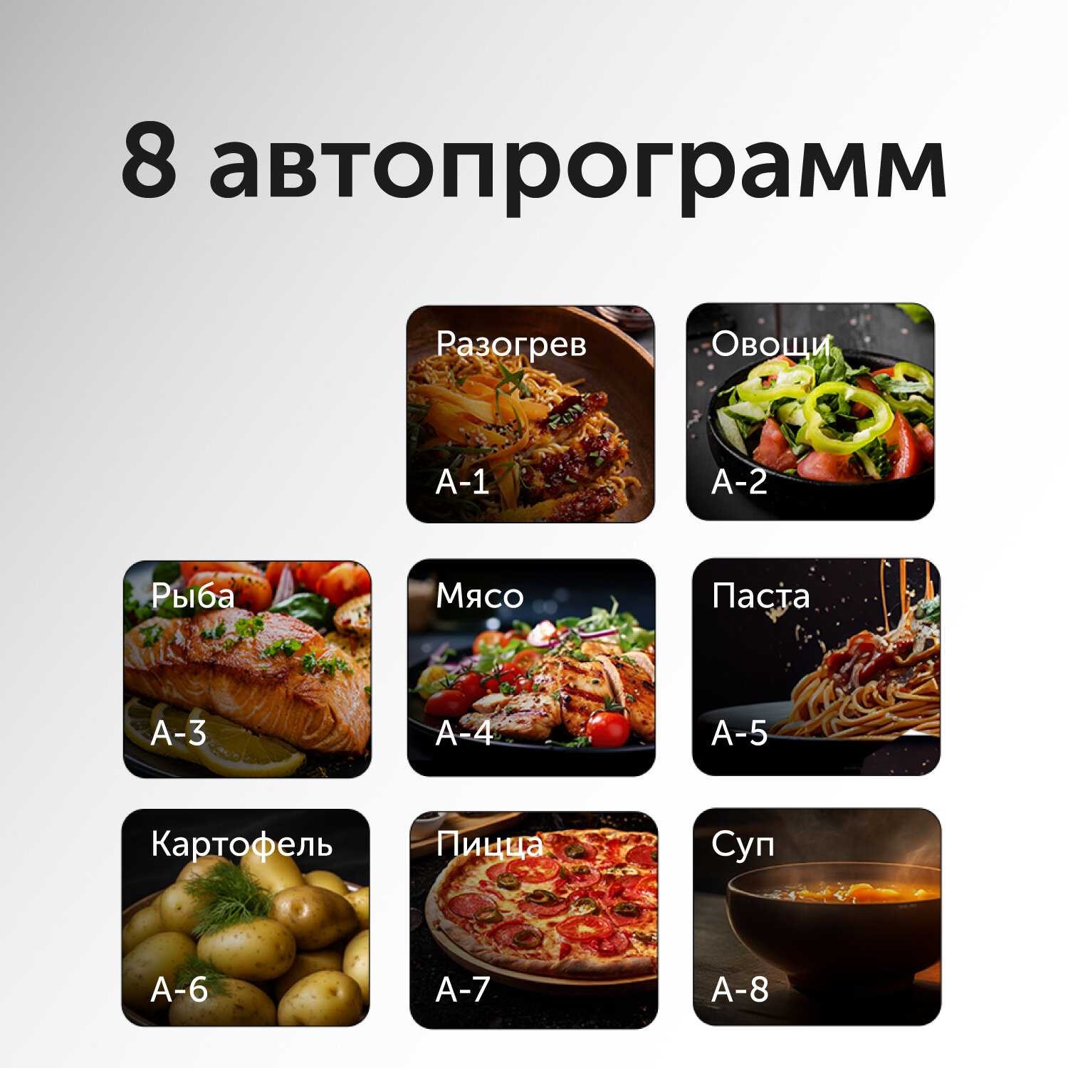 - 8+ предустановленных режимов (разморозка по весу/времени, готовка овощей, супов, пиццы, многоступенчатые рецепты).