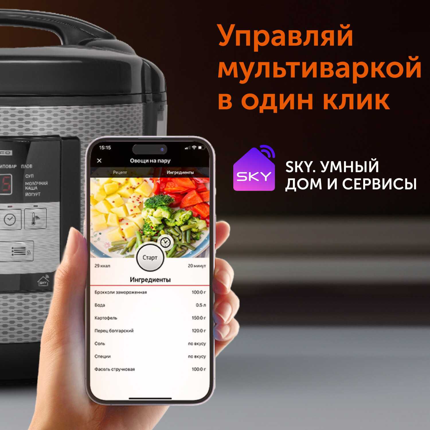 - Функция «Отложенный старт» с таймером до 24 часов — готовка начинается без участия пользователя.