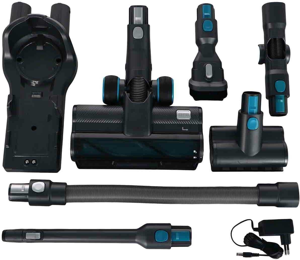 Пылесос обладает богатой комплектацией: турбощётка с подсветкой, щелевая насадка, насадка для мебели/обивки, насадка для труднодоступных мест, комбинированная насадка и даже специализированная для чистки автосалона. Насадки меняются легко. Качество пластика в целом оценивается положительно, но отмечается "хлипкость" некоторых соединений и лючков. Объем пылесборника мал, что требует частого опустошения при уборке с животными. Электронный дисплей, отображающий уровень заряда, режим работы и индикатор заполнения контейнера, работает корректно и считается удобным. Однако общее впечатление от долговечности портят сообщения о быстром износе деталей (шторка пылесборника) и конструктивных просчетах, ведущих к просыпанию мусора.