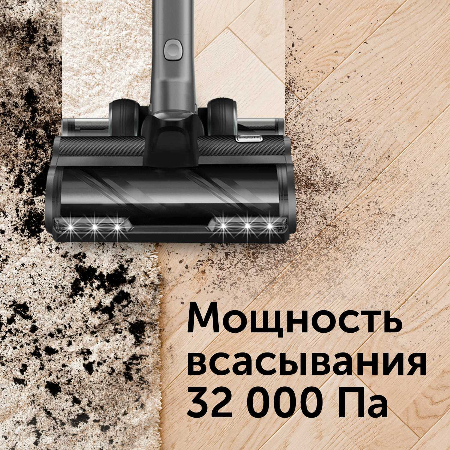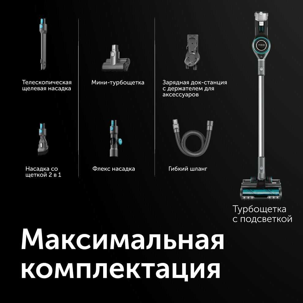 - Высокая мощность всасывания и эффективная турбощётка с подсветкой: