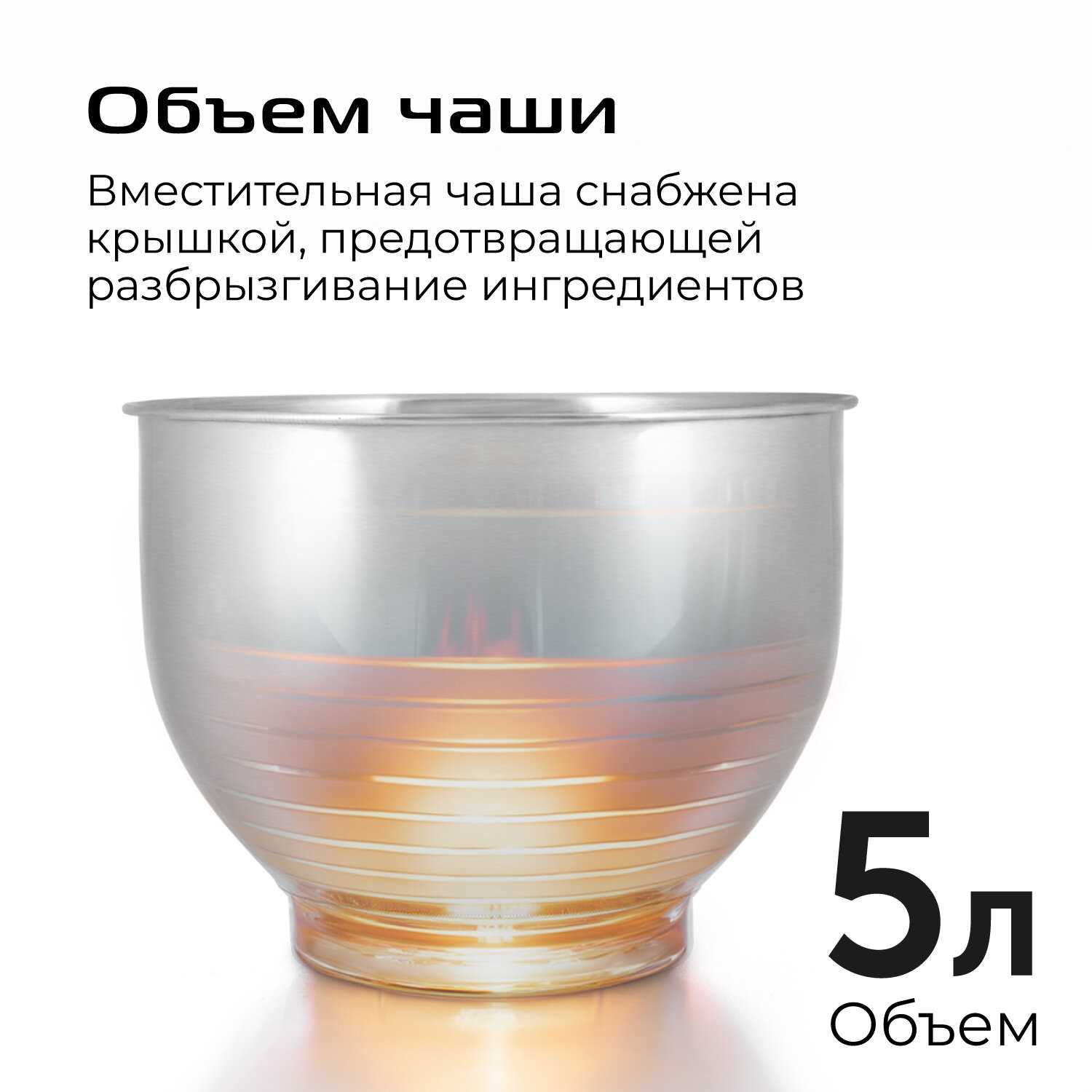 Металлическая чаша объемом 5 литров подходит для больших порций, но при работе с малыми объемами (менее 3 яиц) ингредиенты могут недостаточно обрабатываться. Прозрачная крышка с отверстием предотвращает разбрызгивание и позволяет добавлять продукты без остановки миксера. Фиксация чаши реализована поворотом по часовой стрелке. -