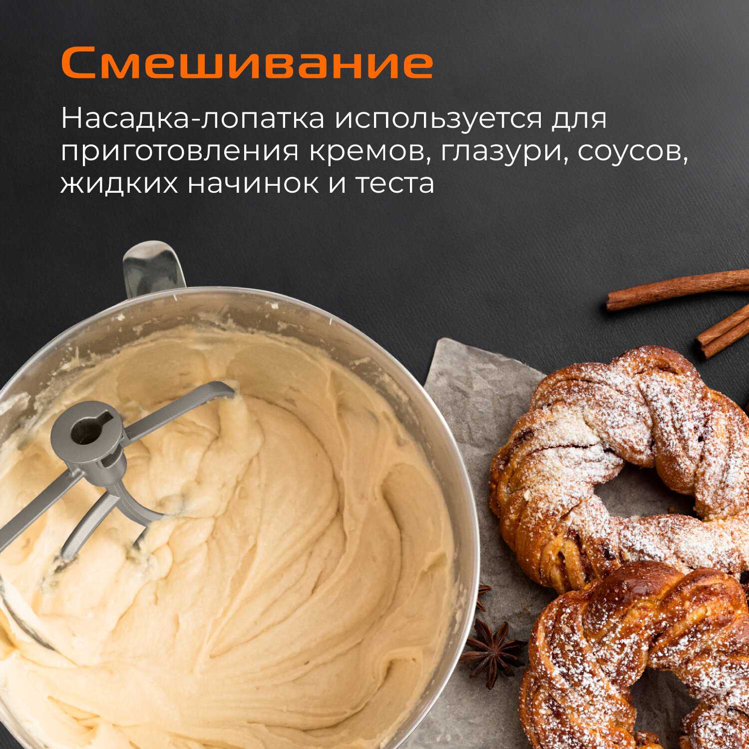 - Три насадки (венчик, крюк для теста, лопатка) из нержавеющей стали обеспечивают универсальность: от взбивания белков до замеса плотного теста.