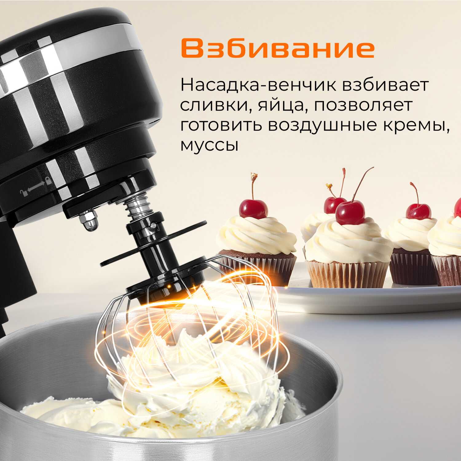 - Взбивает 3 яичных белка до устойчивых пиков за 7–10 минут на 5-й скорости, подходит для безе и бисквитов.