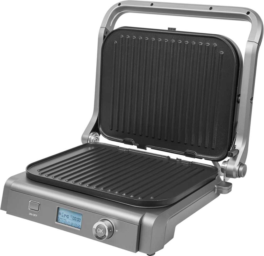 - Датчик толщины продуктов и таймер автоматически определяют время готовки, исключая недожар или пересушивание.