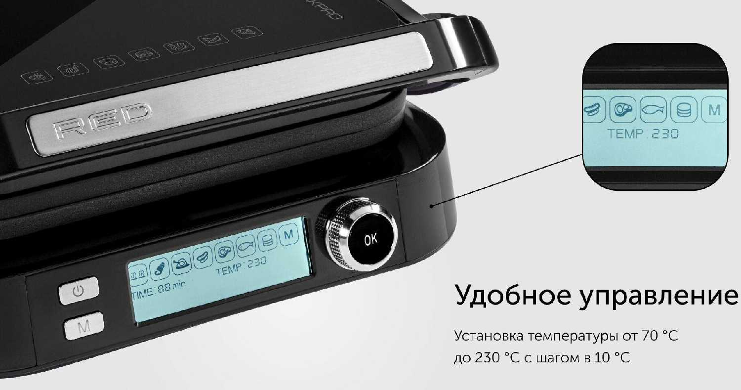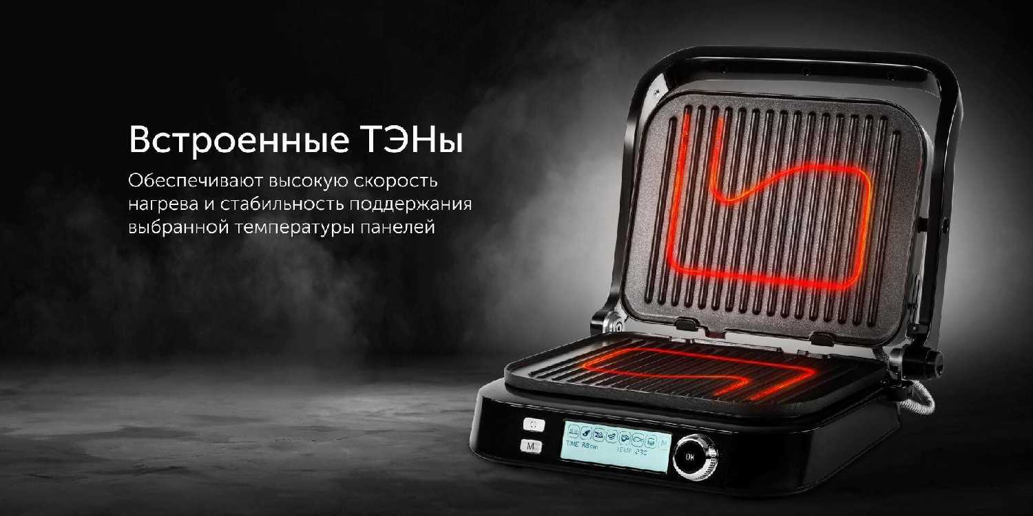 Двусторонний нагрев с керамическим покрытием гарантирует равномерную прожарку без «холодных зон». Режим «барбекю» использует верхние ТЭНы, имитируя эффект открытого огня. Встроенный термостат поддерживает температуру с точностью ±5°C, что критично для стейков средней прожарки. Мощность регулируется механическими переключателями — пользователи отмечают их долговечность по сравнению с сенсорными аналогами. Минусом называют короткий сетевой шнур (85 см), вынуждающий использовать удлинитель. Шум при работе сравним с обычным чайником, но звуковое оповещение некоторые находят излишне громким.