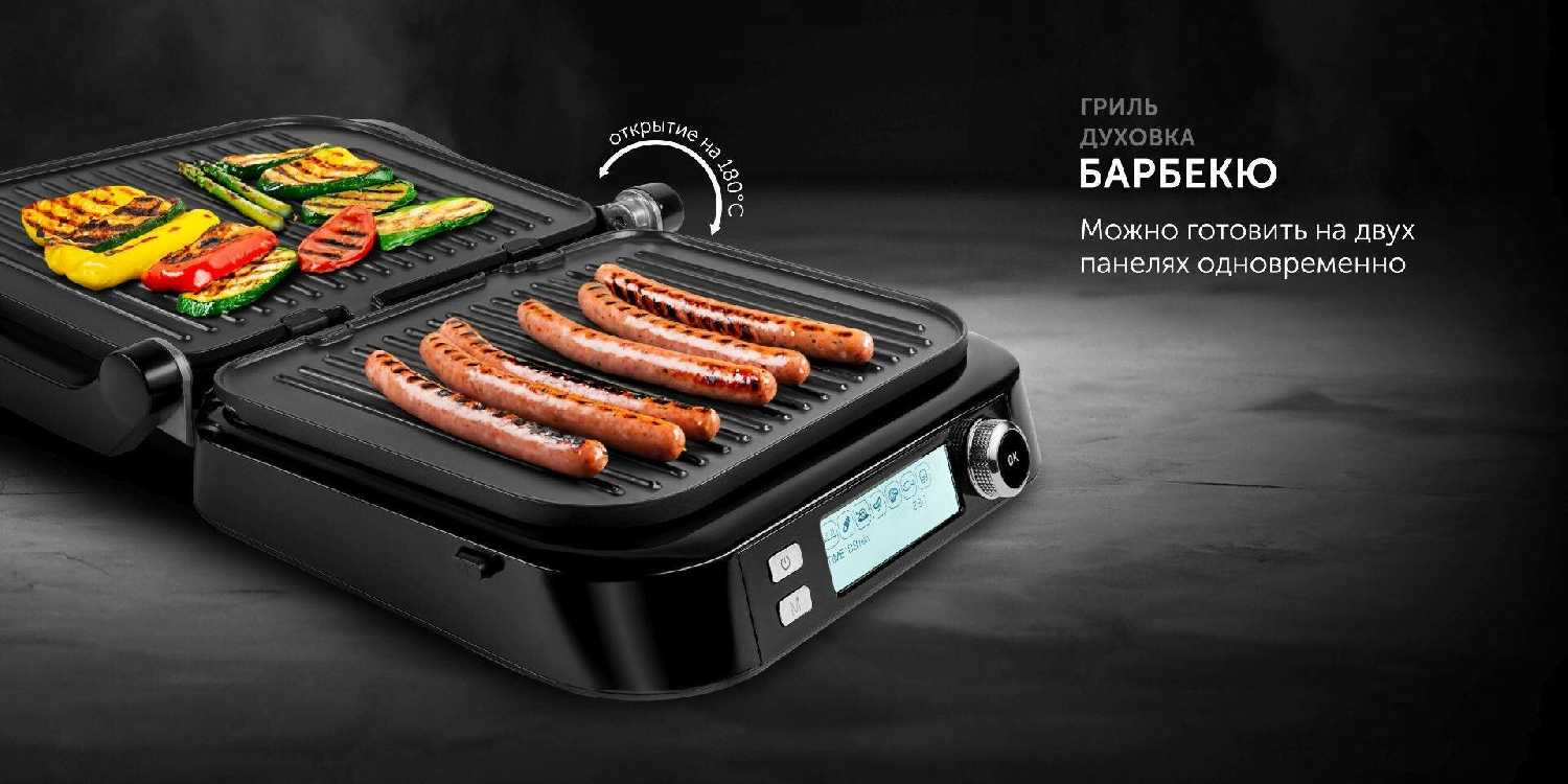 Функция трансформации в барбекю (раскладывание на 180°) позволяет жарить на двух независимых зонах. Пользователи успешно комбинируют мясо с овощами или грибами, регулируя температуру для каждой секции отдельно. Например, курица на одной половине и кабачки на другой готовятся синхронно без смешивания запахов. -
