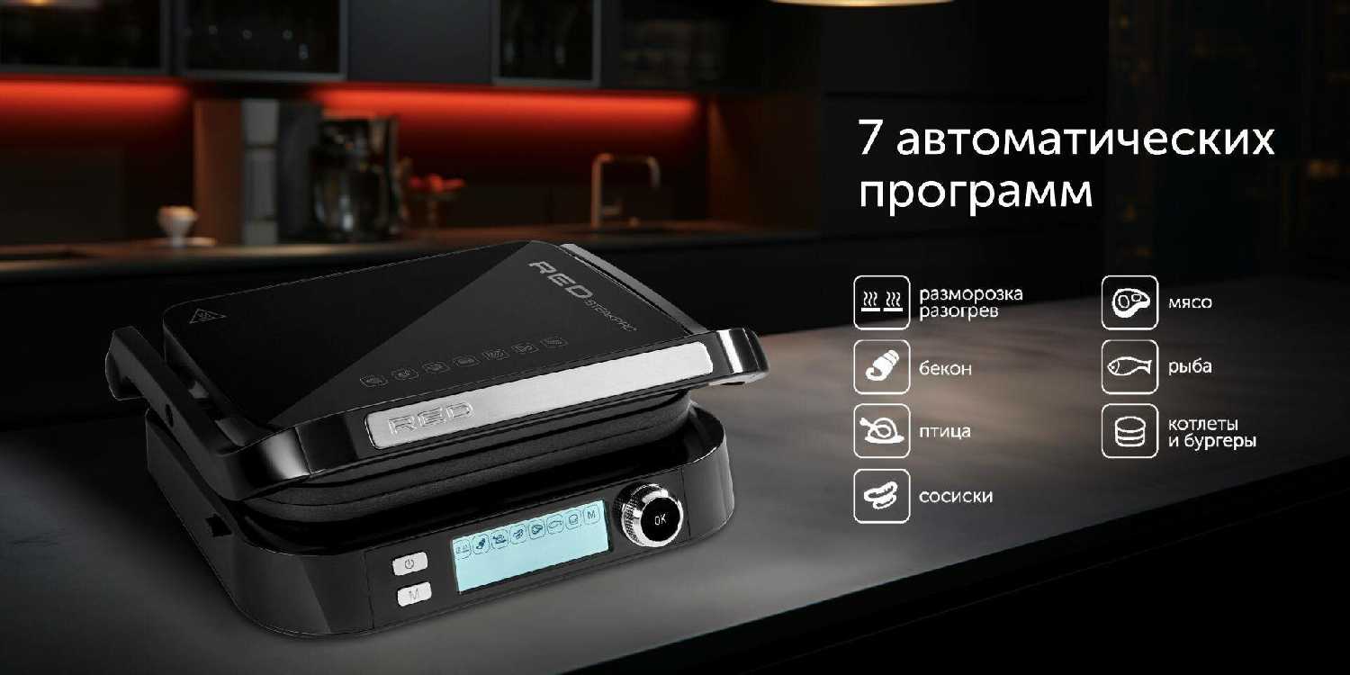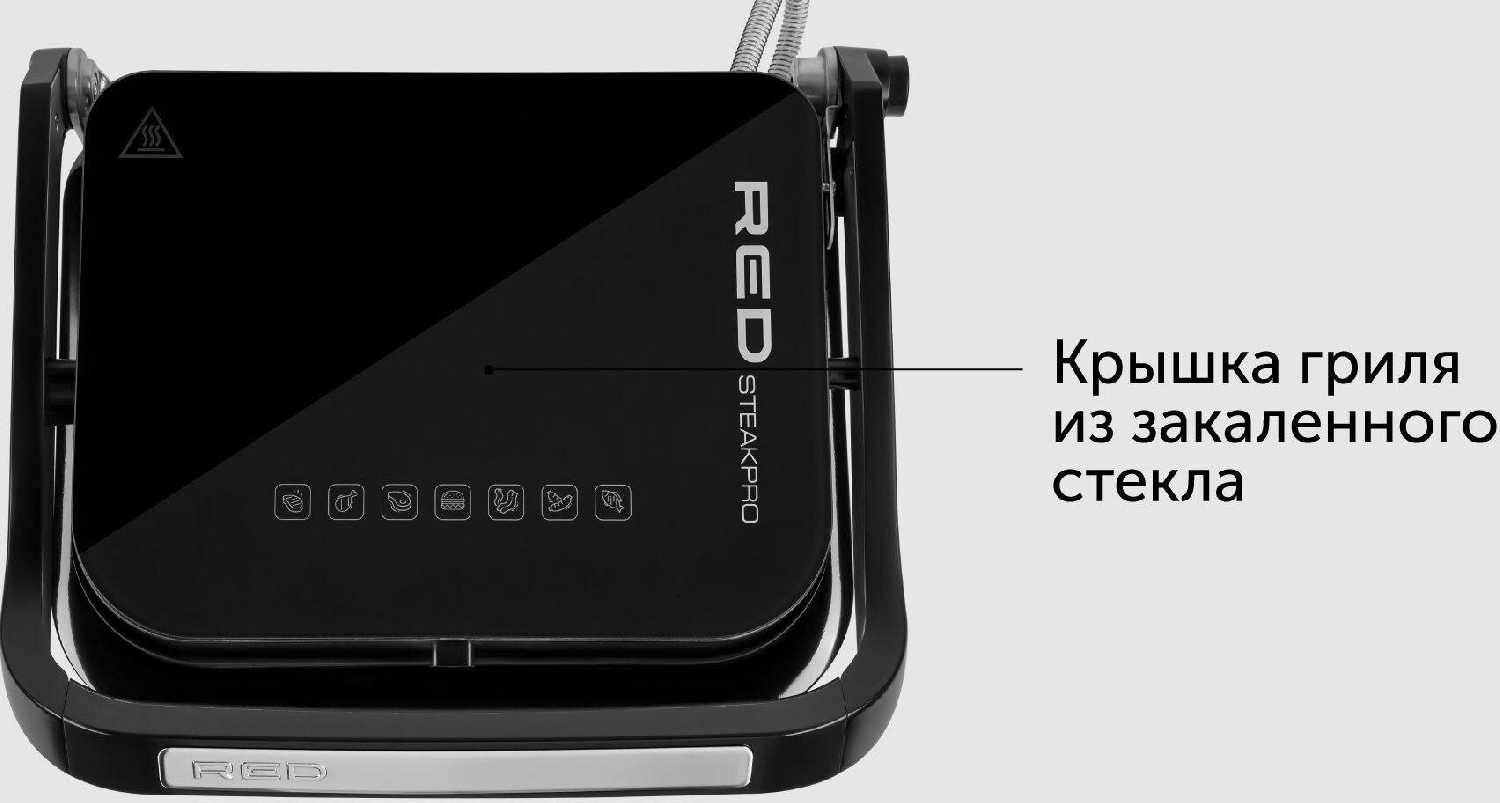 - Технические параметры: мощность до 2000 Вт обеспечивает прожарку стейков толщиной 1 см за 2–3 минуты без потери сочности.