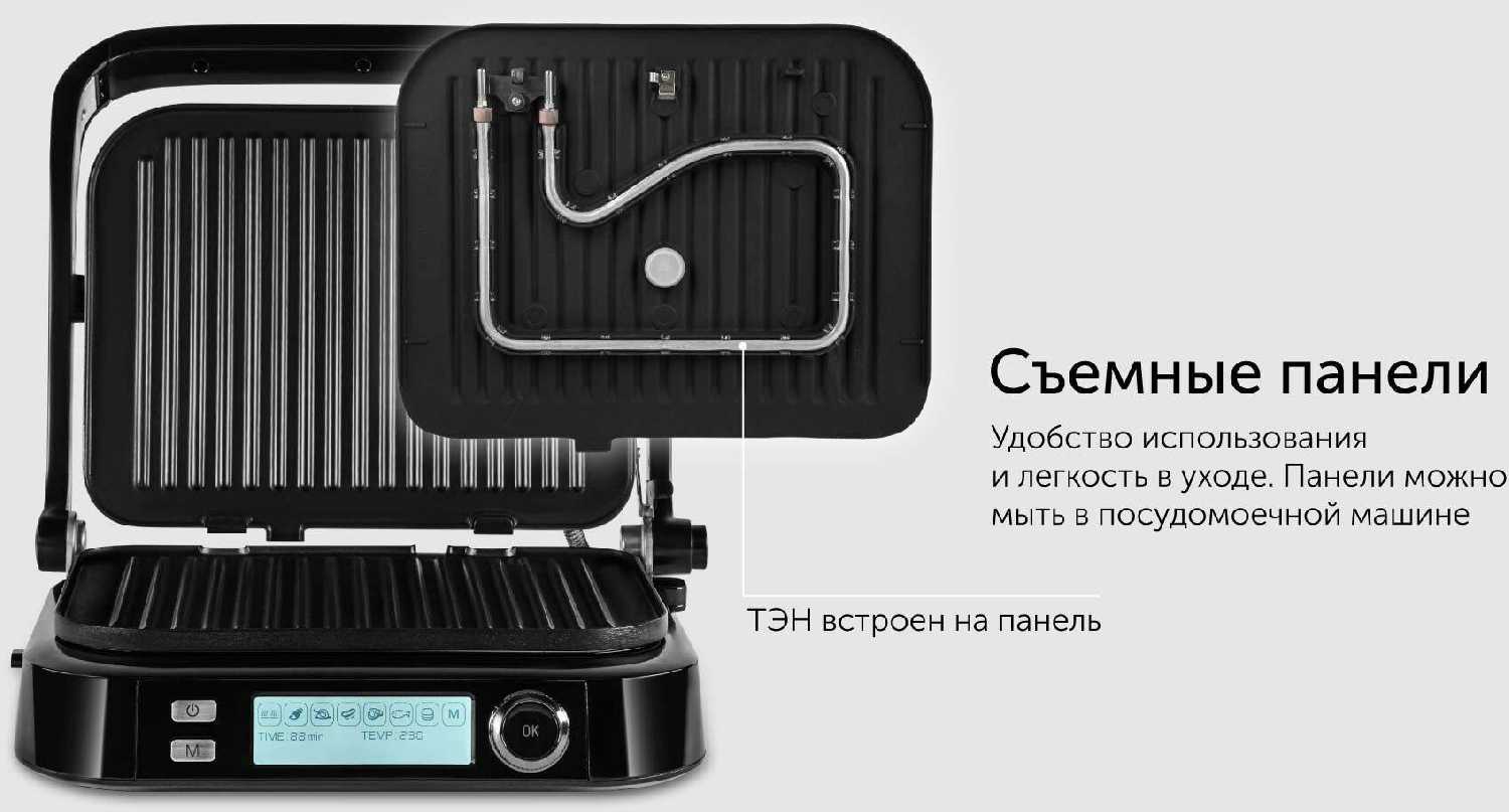 Панели на гриле съёмные, что облегчает процесс ухода за ними. В комплекте есть книга рецептов.