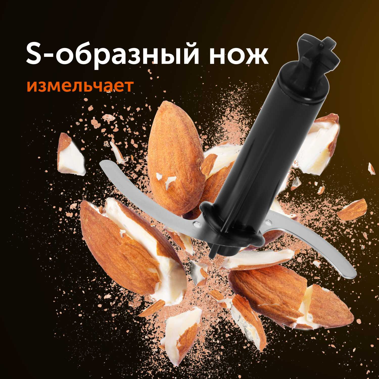- Обеспечивает быстрое и однородное измельчение даже твердых продуктов, таких как замороженные ягоды, орехи и вареное мясо, без застревания лезвий.