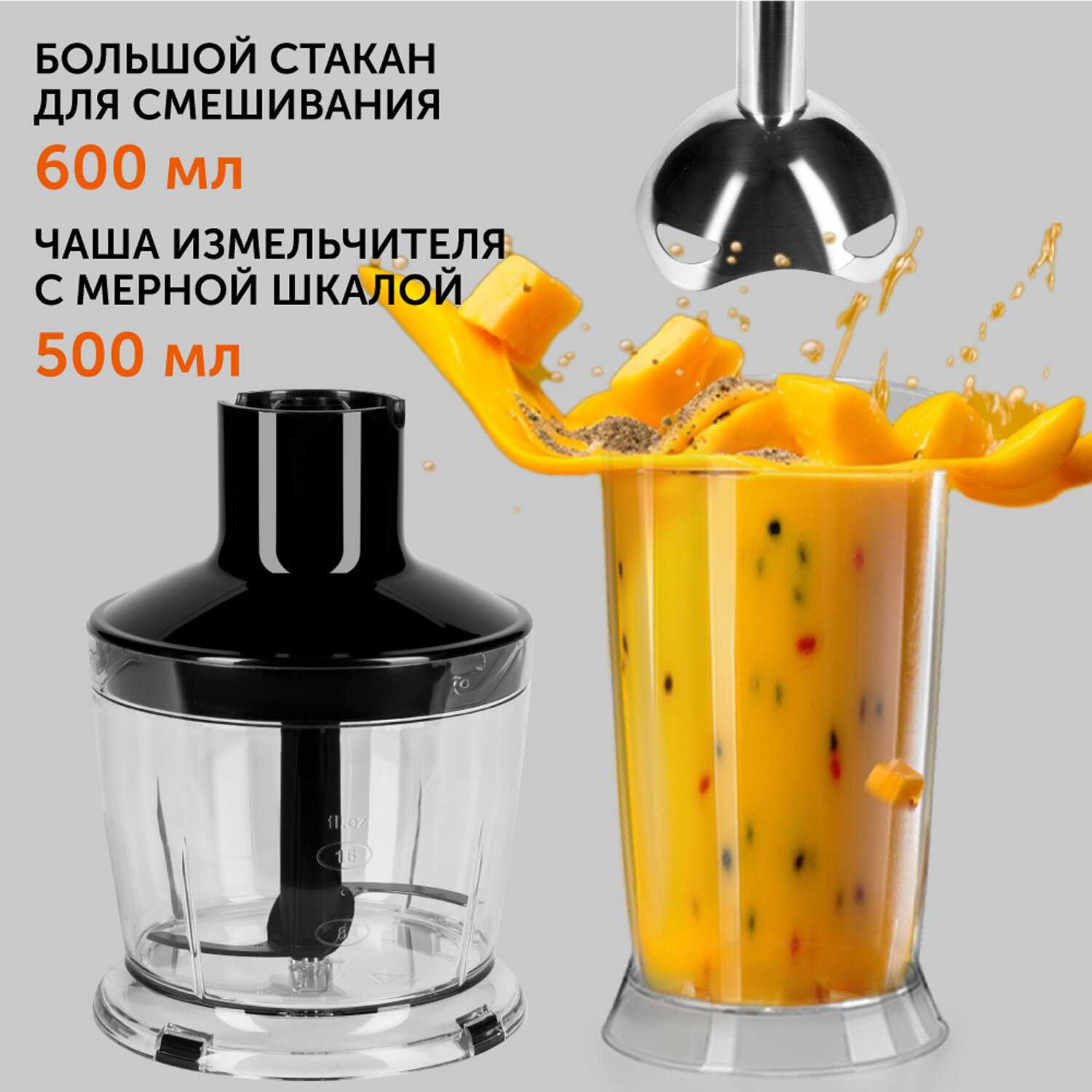 Объем мерного стакана (600 мл) и чаши-измельчителя (500 мл) оптимален для приготовления порций на 2-3 человек. Для приготовления смузи или супа-пюре на большую семью пользователи рекомендуют использовать собственную высокую кастрюлю или кувшин с погружной насадкой. Комплектные емкости идеально подходят для ежедневного использования в быстрых целях и для детского питания. -