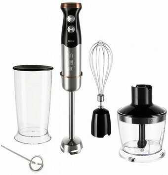 Стандартная комплектация включает погружную ножку, венчик, чашу-измельчитель и специальную насадку для пюре. Насадка для пюре оснащена металлическими лезвиями и создает воздушную текстуру без комков. Венчик эффективно взбивает яйца и сливки, а измельчитель быстро перерабатывает мясо, овощи и орехи. Дополнительно некоторые модели комплектуются насадками для нарезки кубиками и терками. -