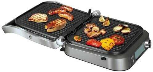- Электронный термостат с шагом регулировки 10°C позволяет точно задавать температуру для разных типов продуктов (стейки, рыба, овощи).