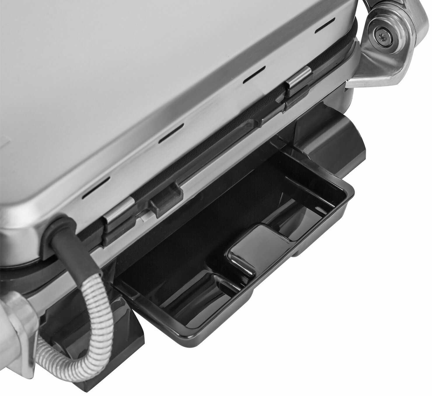Поддон в задней части эффективно собирает до 95% жира, но требует очистки после каждого использования. При готовке сочных стейков или жирных колбасок ёмкость заполняется быстро. Недостаток — отсутствие индикатора наполнения, из-за чего возможны протечки при переливе. -