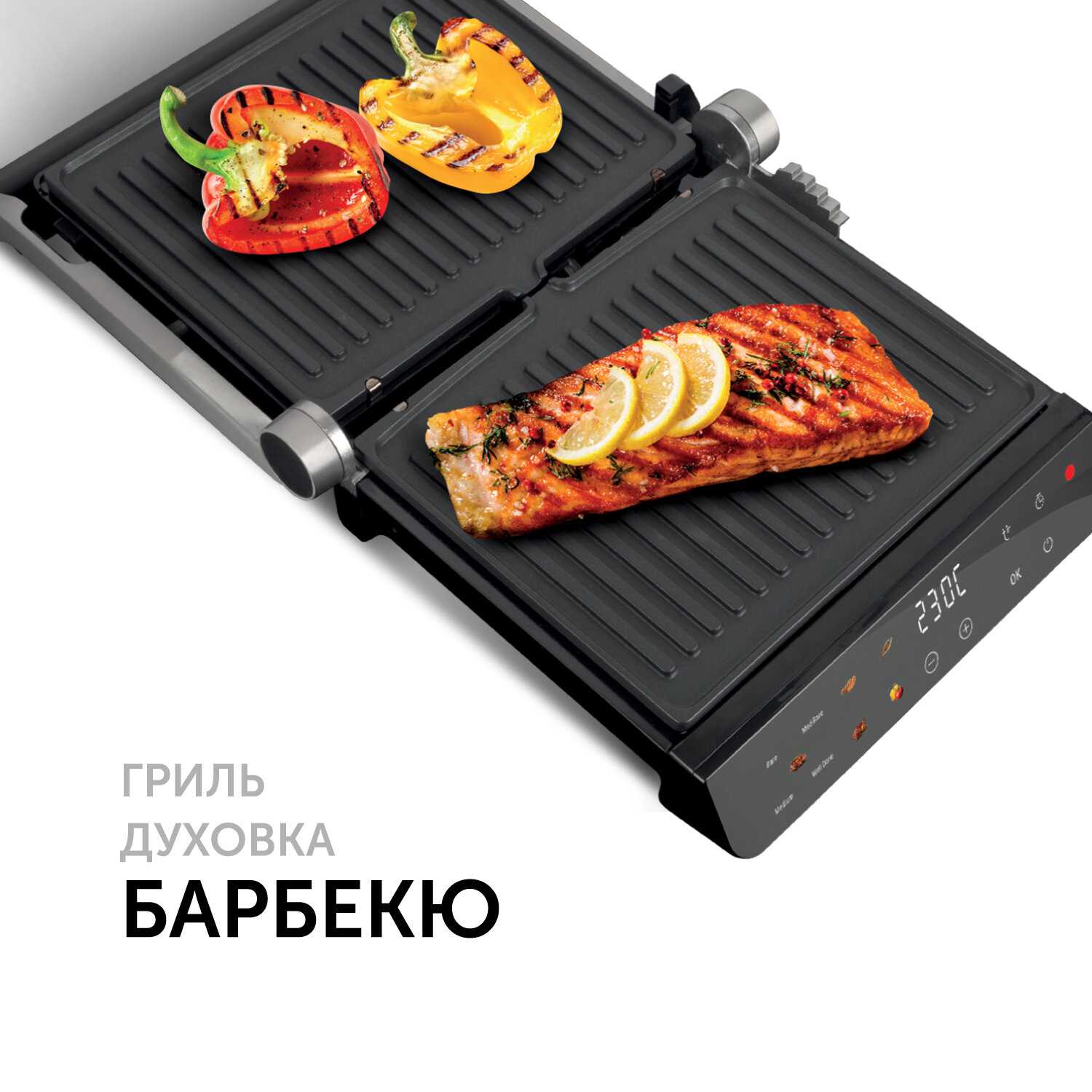 Точный контроль температуры – регулировка от 150°C до 250°C позволяет готовить не только стейки, но и рыбу, овощи и даже