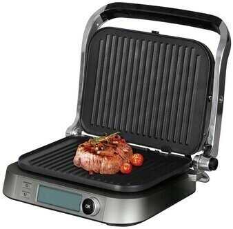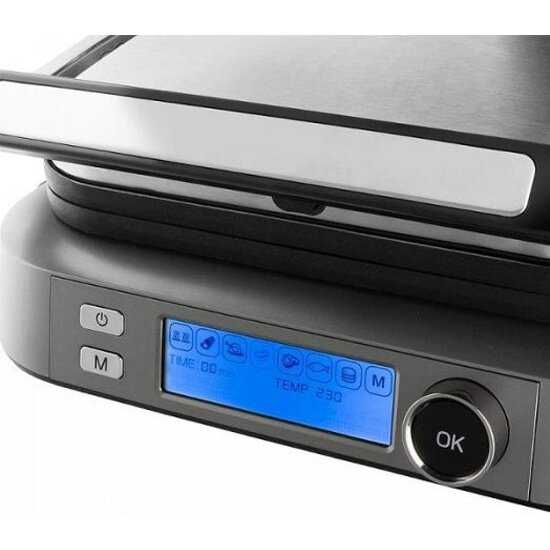 - Электронный термостат с шагом регулировки 10°C позволяет точно задавать температуру для разных типов продуктов (стейки, рыба, овощи).