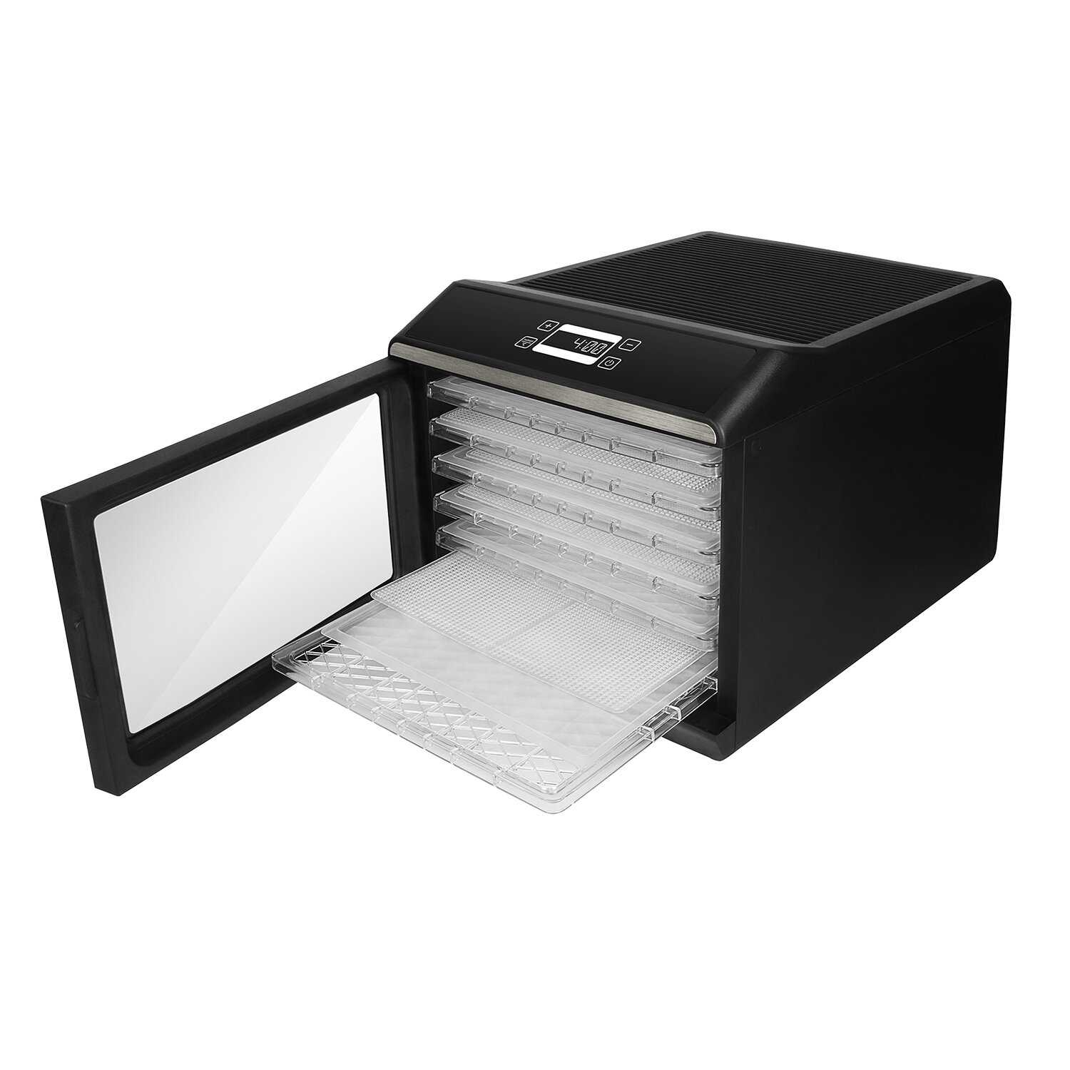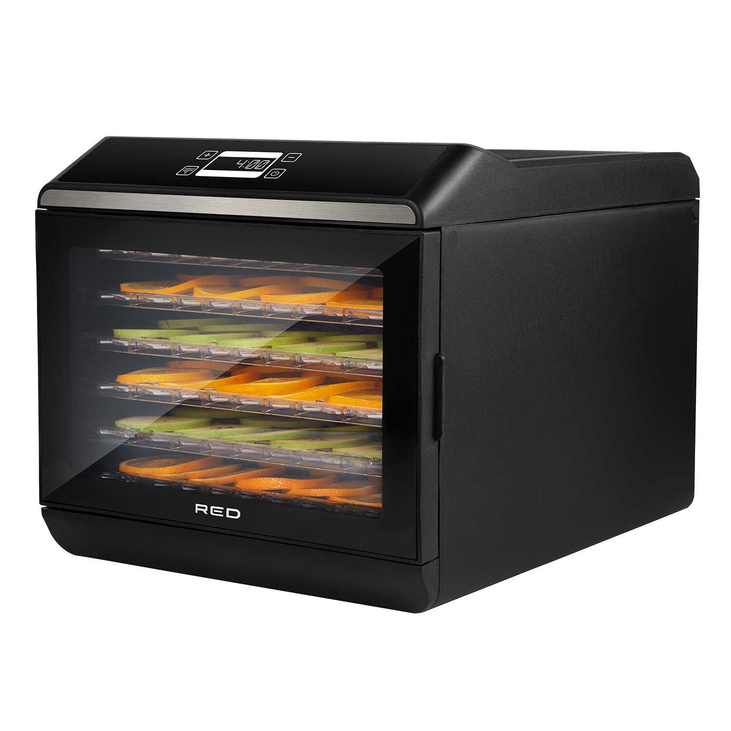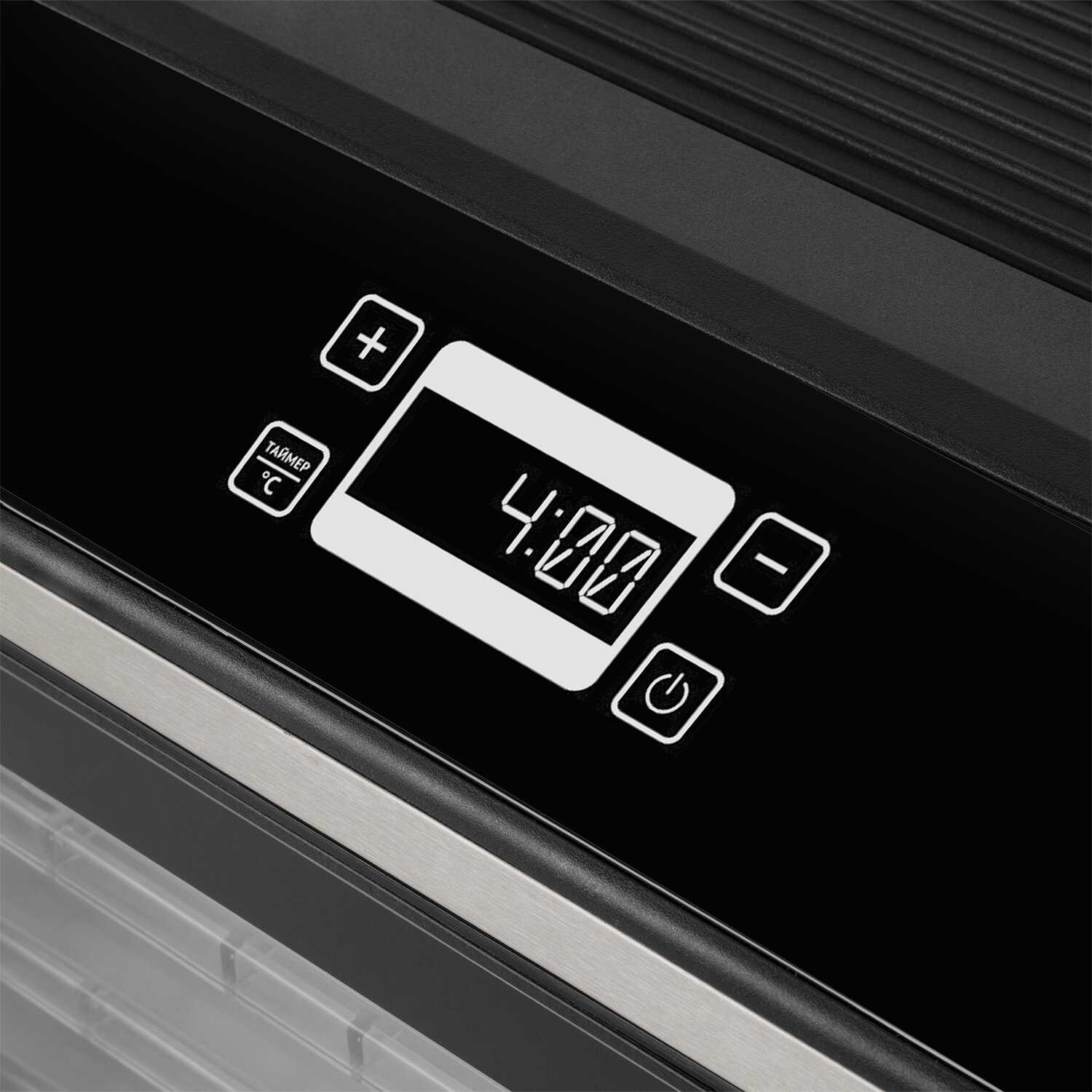 Диапазон нагрева – от 30°C до 70°C с шагом 5°C. Это позволяет подбирать деликатные режимы для трав (40-45°C), сохранять яркий вкус ягод (50-55°C) или готовить мясные джерки (65-70°C). Цифровой дисплей обеспечивает точный контроль параметров. -