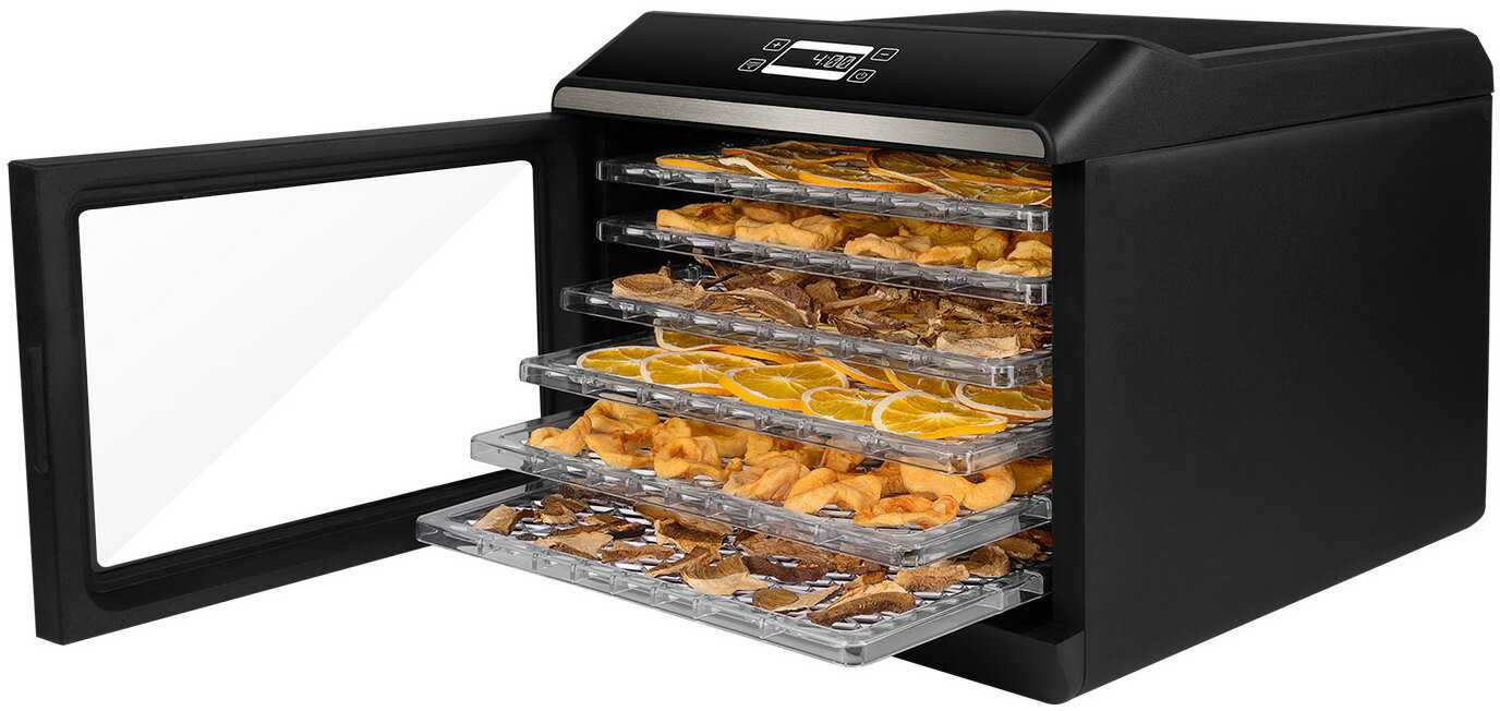 Одновременно можно заполнить все 6 уровней: например, 3 кг грибов, 4 кг яблок или 2 кг мясных долек. Высота между поддонами регулируется, что удобно для крупных долек тыквы или целых томатов черри. -