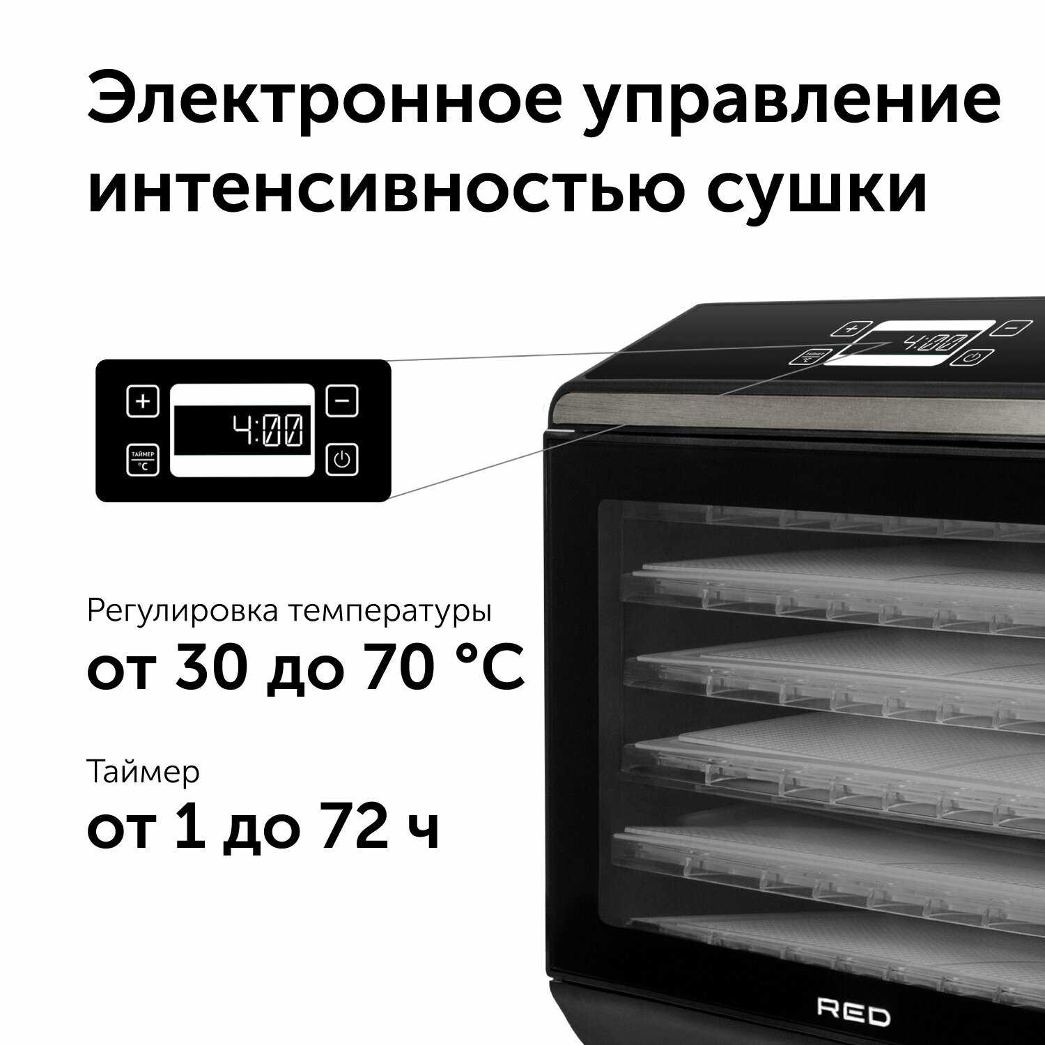 - Цифровой таймер с шагом 1 час (максимум 72 часа) и регулировка температуры от 30°C до 70°C с шагом 5°C.